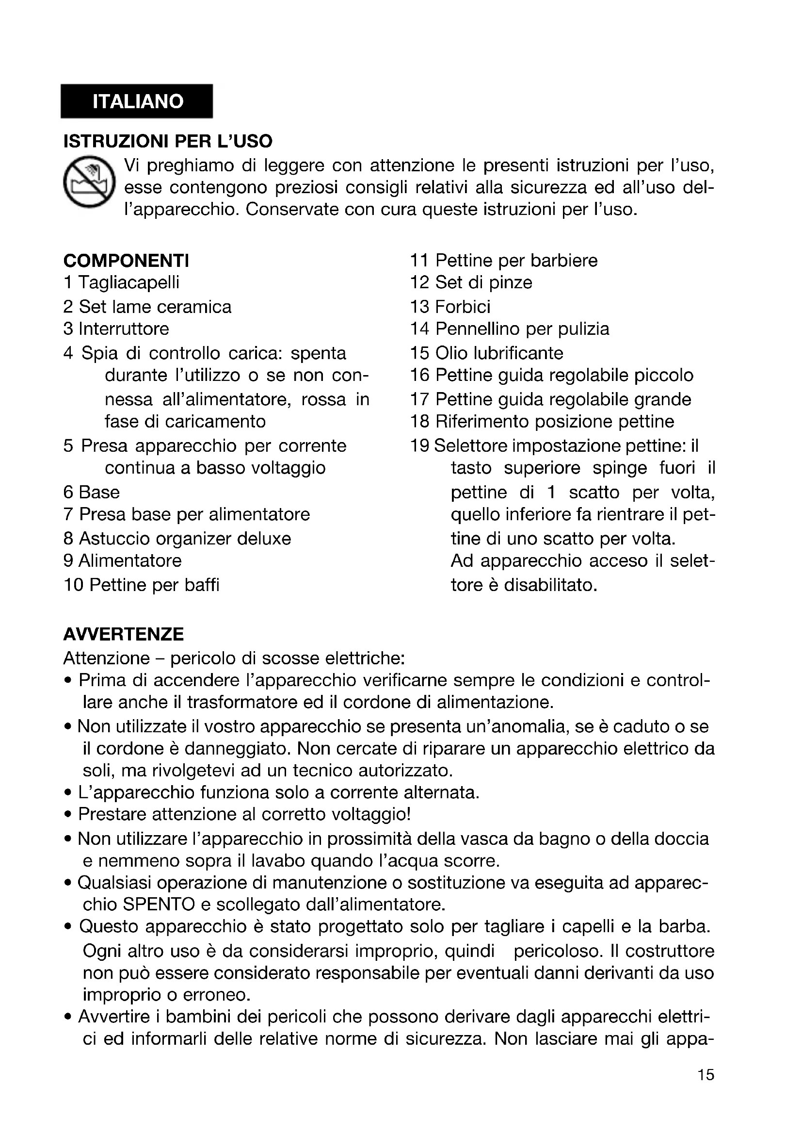 - Avvertire i bambini dei pericoli che possono derivare dagli apparecchi elettri- ci ed informarli delle relative norme di sicurezza. Non lasciare mai gli appa- COMPONENTI 1 Tagliacapelli 2 Set lame ceramica 3 Interruttore 4 Spia di controllo carica: spenta durante l’utilizzo o se non con- nessa all’alimentatore, rossa in fase di caricamento 5 Presa apparecchio per corrente continua a basso voltaggio 6 Base 7 Presa base per alimentatore 8 Astuccio organizer deluxe 9 Alimentatore 10 Pettine per baffi 11 Pettine per barbiere 12 Set di pinze 13 Forbici 14 Pennellino per pulizia 15 Olio lubrificante 16 Pettine guida regolabile piccolo 17 Pettine guida regolabile grande 18 Riferimento posizione pettine 19 Selettore impostazione pettine: il tasto superiore spinge fuori il pettine di 1 scatto per volta, quello inferiore fa rientrare il pet- tine di uno scatto per volta. Ad apparecchio acceso il selet- tore è disabilitato. ITALIANO 00060452 INTERNO 7-11-2005 14:43 Pagina 1516 recchi elettrici a portata di mano dei bambini.
