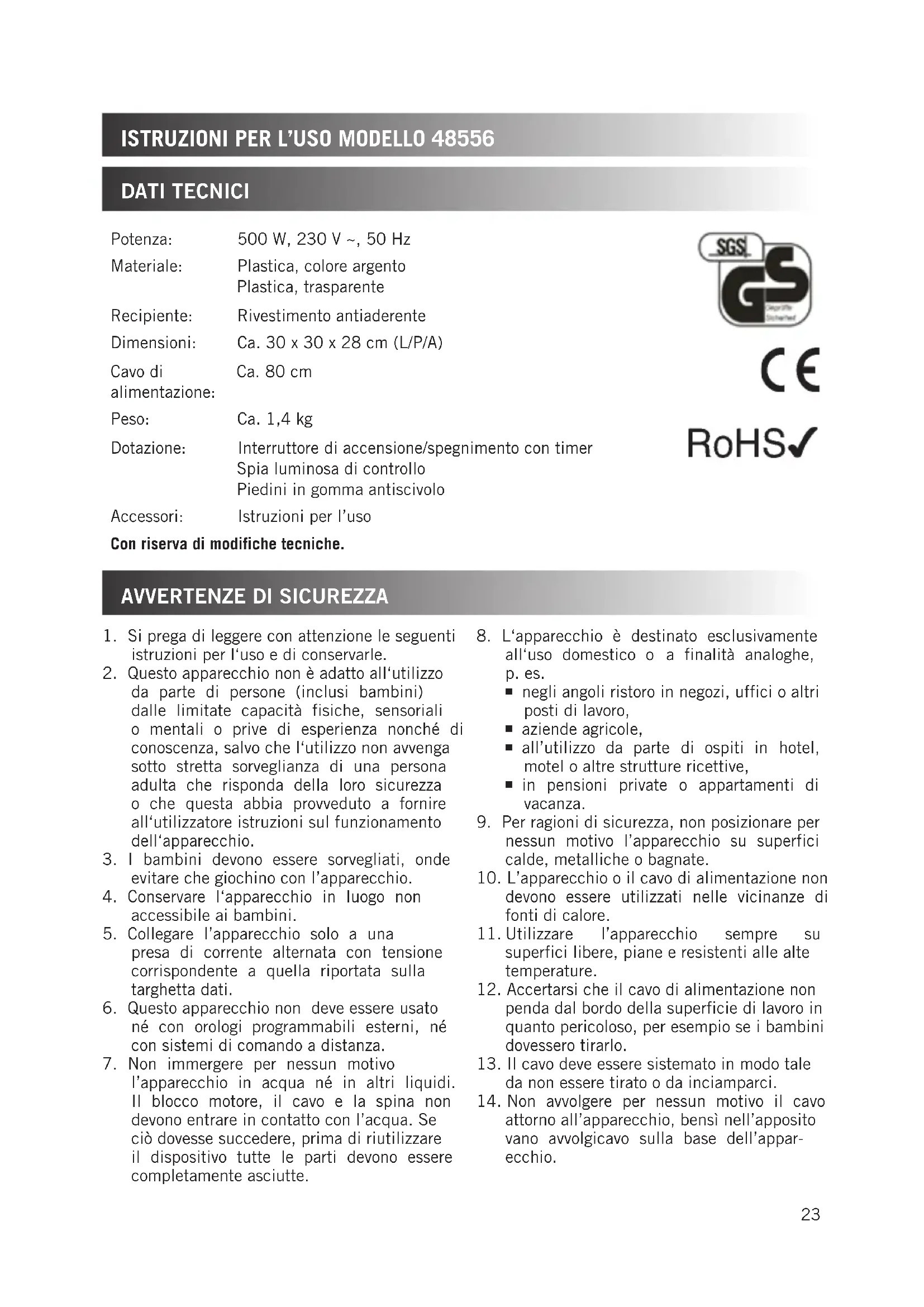 attorno all’apparecchio, bensì nell’apposito vano avvolgicavo sulla base dell’appar- ecchio. Potenza: 500 W, 230 V ~, 50 Hz Materiale: Plastica, colore argento Plastica, trasparente Recipiente: Rivestimento antiaderente Dimensioni: Ca. 30 x 30 x 28 cm (L/P/A) Cavo di alimentazione: Ca. 80 cm Peso: Ca. 1,4 kg Dotazione: Interruttore di accensione/spegnimento con timer Spia luminosa di controllo Piedini in gomma antiscivolo Accessori: Istruzioni per l’uso Con riserva di modifiche tecniche.24
