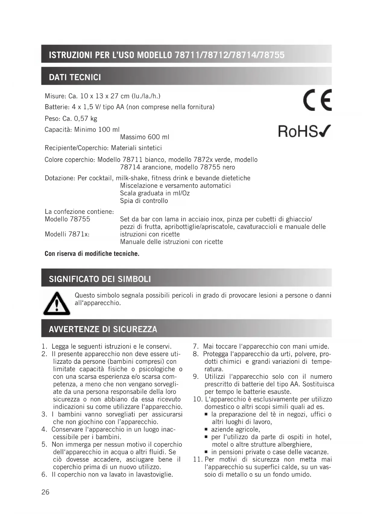 Scarica le istruzioni per il tuo Mixer in formato PDF gratuitamente! Trova il tuo manuale 78712 - UNOLD e riprendi in mano il tuo dispositivo elettronico. In questa pagina sono pubblicati tutti i documenti necessari per l'utilizzo del tuo dispositivo. 78712 del marchio UNOLD.