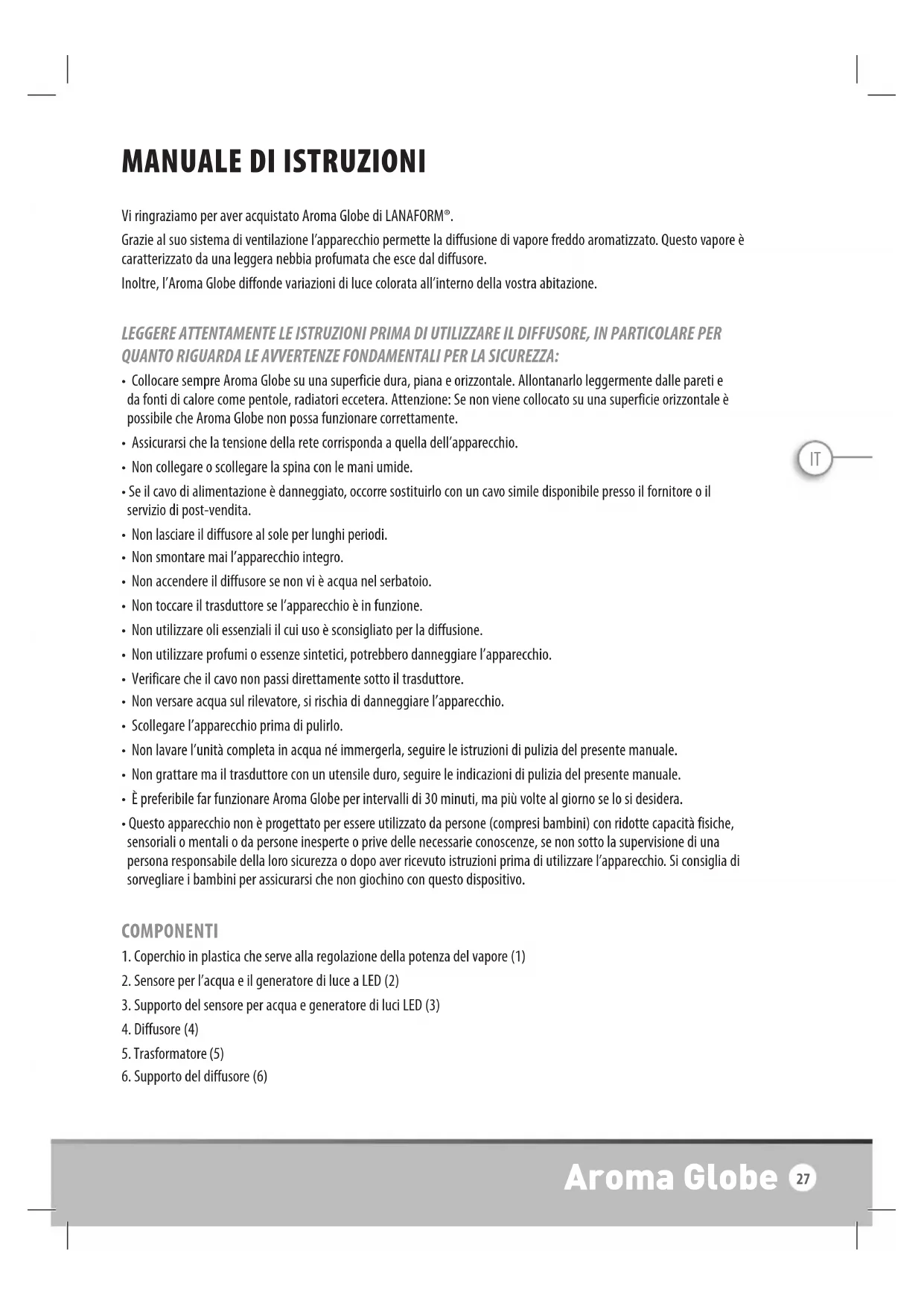 Vi ringraziamo per aver acquistato Aroma Globe di LANAFORM®. Grazie al suo sistema di ventilazione l’apparecchio permette la diffusione di vapore freddo aromatizzato. Questo vapore è caratterizzato da una leggera nebbia profumata che esce dal diffusore. Inoltre, l’Aroma Globe diffonde variazioni di luce colorata all’interno della vostra abitazione. LEGGERE ATTENTAMENTE LE ISTRUZIONI PRIMA DI UTILIZZARE IL DIFFUSORE, IN PARTICOLARE PER QUANTO RIGUARDA LE AVVERTENZE FONDAMENTALI PER LA SICUREZZA: