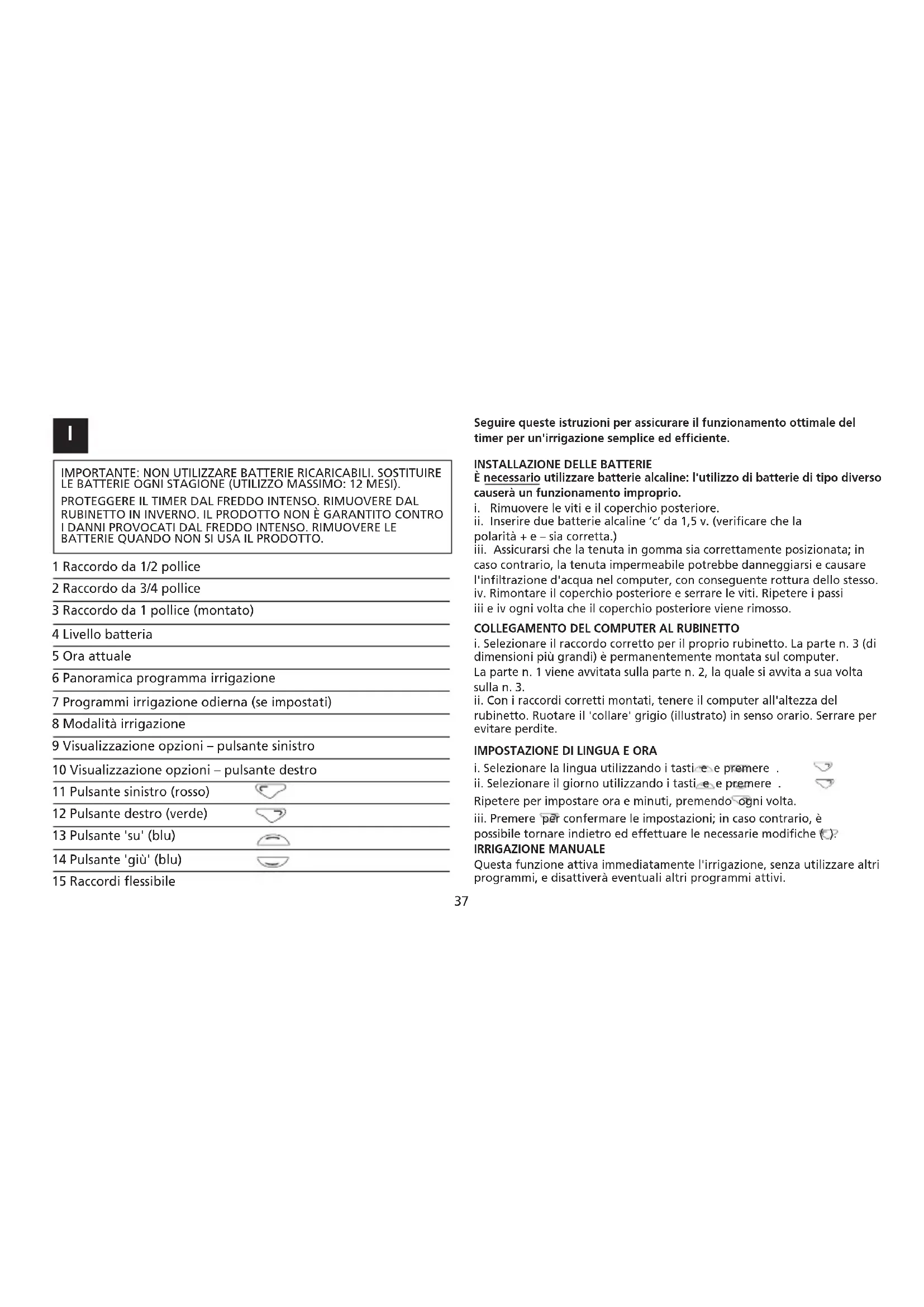 1 Raccordo da 1/2 pollice 2 Raccordo da 3/4 pollice 3 Raccordo da 1 pollice (montato) 4 Livello batteria 5 Ora attuale 6 Panoramica programma irrigazione 7 Programmi irrigazione odierna (se impostati) 8 Modalità irrigazione 9 Visualizzazione opzioni – pulsante sinistro 10 Visualizzazione opzioni – pulsante destro 11 Pulsante sinistro (rosso) 12 Pulsante destro (verde) 13 Pulsante 'su' (blu) 14 Pulsante 'giù' (blu) 15 Raccordi flessibile