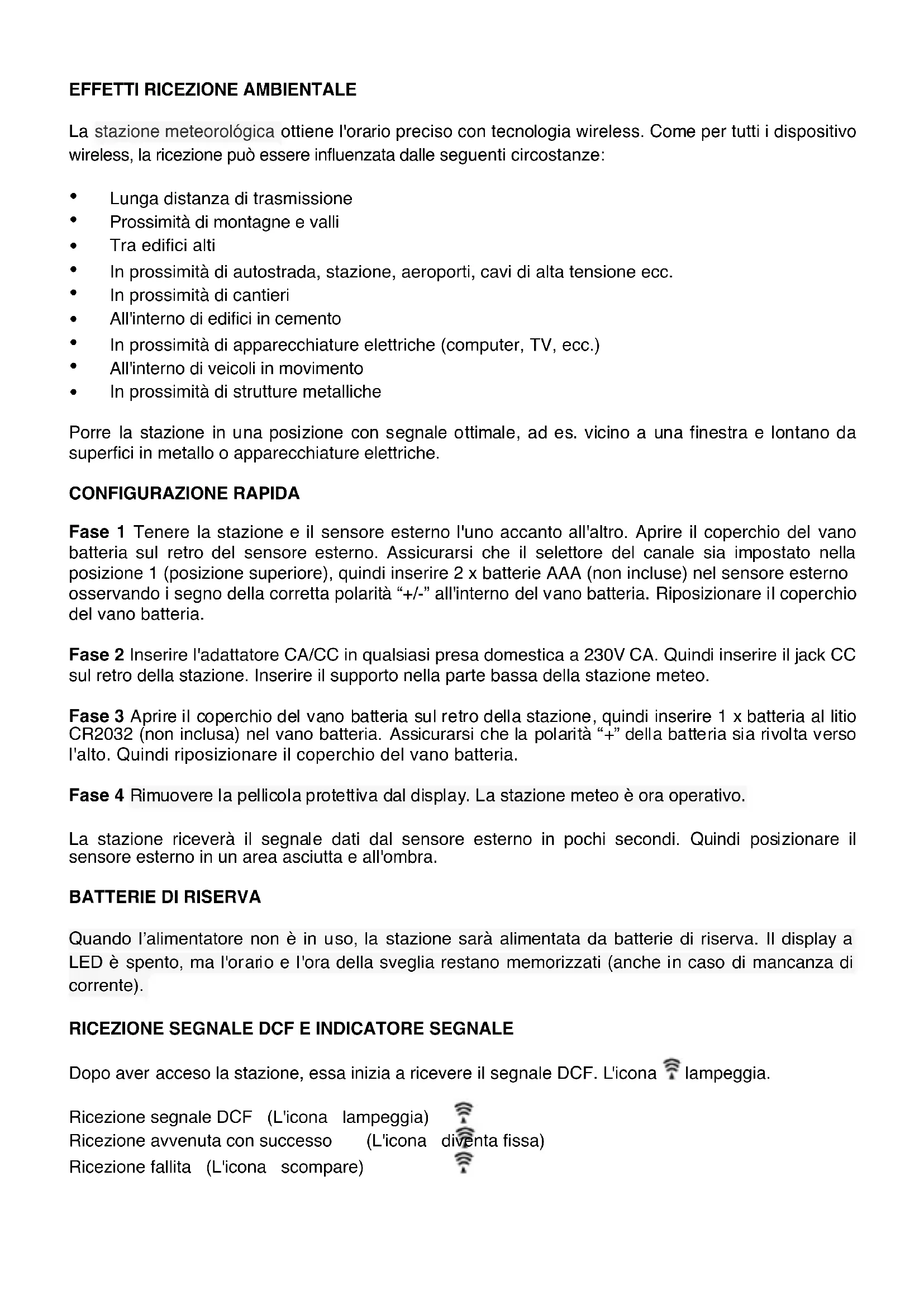 Dopo aver acceso la stazione, essa inizia a ricevere il segnale DCF. L'icona lampeggia. Ricezione segnale DCF (L'icona lampeggia) Ricezione avvenuta con successo (L'icona diventa fissa) Ricezione fallita (L'icona scompare)Durante la ricezione, premere il pulsante / WAVE per visualizzare l'indicazione della modalità di ricezione e la potenza di segnale: Se è rilevato un segnale DCF forte, il display mostra 3 barrette . Se è rilevato un segnale DCF debole o assente, il display mostra o . Durante la ricezione, la potenza di segnale può passare da 1 barretta a 2 barrette a 3 barrette. Ciò è normale in quanto l'orologio sta rilevando un segnale DCF e altri segnali nell'aria allo stesso tempo. Premendo il pulsante SET si ritornerà alla visualizzazione dell'orario con l'icona che lampeggia. Ricezione avvenuta con successo o ricezione fallita L'icona diventa fissa accesa (smette di lampeggiare) quando la ricezione avviene con successo L'icona scompare quando la ricezione è fallita Ricezione automatica e ricezione manuale La stazione avvia la ricezione automatica ogni giorno all'1:00, 2:00 e 3:00. Se la ricezione del segnale DCF alle 3:00 fallisce, essa sarà riprovata alle 4:00. Se la ricezione fallisce nuovamente, essa sarà riavviata alle 5:00. Se essa fallisce nuovamente, essa sarà riavviata automaticamente all'1:00 del giorno successivo. Per la ricezione manuale basta semplicemente premere e tenere premuto il pulsante / WAVE ,la stazione emetterà un breve beet e avvierà la ricezione manuale. Premere e tenere premuto il pulsante / WAVE per sospendere la ricezione DCF. Se la stazione meteo sta ricevendo il segnale orario radiocontrollato, il display si oscurerà gradualmente. Riprenderà il livello di luminosità originariamente selezionato dopo il completamento della ricezione radiocontrollata dell’orario. Durante la ricezione DCF tutti i pulsanti non funzionano e non viene effettuata la misurazione della temperatura. Le letture della temperatura saranno ottenute in modo stabile e diventano più precise dopo che l'orologio della stazione è acceso per circa 30 minuti. Per cancellare la ricezione DCF in modo permanente Premere e tenere premuto il pulsante / WAVE e il pulsante contemporaneamente per 2 secondi, la stazione emetterà 2 beep brevi e la funzione radiocontrollata sarà disabilitata in modo permanente. Per riprendere la funzione radiocontrollata, premere e tenere premuto il pulsante / WAVE e il pulsante contemporaneamente per 2 secondi, la stazione emetterà 2 beep brevi e riprenderà immediatamente la ricezione DCF. PREVISIONI METEO La stazione meteo integra un barometro che misura la pressione atmosferica. Dopo l’accensione, il display mostra le icone SOLEGGIATO & NUVOLOSO. La stazione meteo a LED impiega circa 24 ore per raccogliere i dati delle variazioni nella pressione atmosferica ed è in grado di fare previsioni sulle condizioni meteo delle successive 6-12 ore. Le previsioni del tempo viene rappresentato con 4 icone meteorologiche diverse: