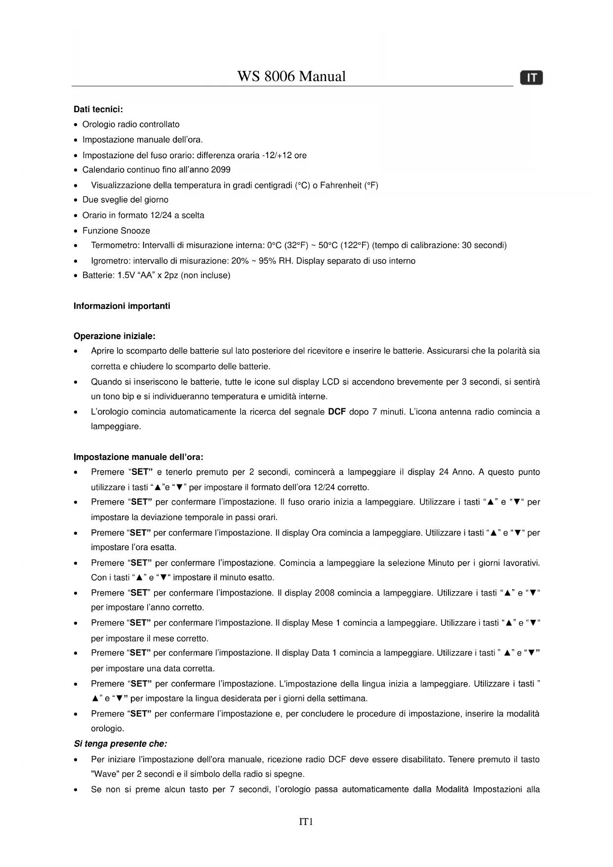 Impostazione delle sveglie di ogni giorno: Questo orologio dispone di una sveglia quotidiana. Per visualizzare gli orari delle sveglie impostati, premere brevemente ALARM, il display passa dalla modalità Orologio a Sveglia; se si preme nuovamente il tasto, l’orologio ritorna al display del’ora normale. Per impostare le sveglie di ogni giorno procedere nel modo seguente: Premere “ALARM” e tenerlo premuto per due secondi, fino a quando appaiono l’ora della sveglia e l’icona lampeggiante. Il display Ora nell’ora della sveglia comincia a lampeggiare. Utilizzare i tasti “▲” e “▼“ per impostare l’ora desiderata. Premere “ALARM” per confermare l’impostazione. Il display Minuto nell’ora della sveglia comincia a lampeggiare. Utilizzare i tasti “▲” e “▼ per impostare il minuto desiderato. Premere “ALARM” per confermare l’impostazione e per concludere la procedura di impostazione. Per attivare o disattivare le sveglie del giorno, nella modalità sveglia, premere “UP” per cambiare la funzione sveglia. Si tenga presente che: Se non si preme alcun tasto per 7 secondi, l’orologio passa automaticamente dalla modalità impostazioni alla modalità orologio Normale. La sveglia suona per 2 minuti se non la si disattiva premendo un tasto qualsiasi. In questo caso la sveglia si ripeterà automaticamente dopo 24 ore. L’aumento del suono della sveglia (crescendo, durata: 2 minuti) modifica il volume 4 volte mentre si sente il segnale della sveglia. Funzione SNOOZE automatica: Per attivare la funzione snooze automatica: mentre la sveglia suona, premere “SNOOZE” per attivare la funzione snooze. Quando tale funzione è attivata, appare sul display il simbolo della Sveglia. Questa operazione porta la sveglia indietro di 5 minuti e in questo momento la sveglia ripartirà. La funzione snooze può essere interrotta premendo un tasto qualsiasi, e può essere ripetuta fino a sette volte. Display della temperatura in °C/°F: La temperatura viene visualizzata in gradi centigradi (°C) o Fahrenheit (°F). Premere brevemente il tasto “▼ “ per poter passare da un singolo modello all’altro. Ricezione del segnale radio: L’orologio avvia automaticamente la ricerca del segnale DCF 7 minuti dopo ogni nuovo avvio o cambio con nuoveIT3 batterie. L’icona antenna radio comincia a lampeggiare. Alla 1:00 di notte l’orologio effettua automaticamente la procedura di sincronizzazione con il segnale DCF per correggere qualsiasi deviazione verso l’ora esatta. Se questo tentativo di sincronizzazione non riesce (l’icona antenna radio scompare dal display), il sistema tenterà automaticamente ancora la sincronizzazione alla successiva ora intera. Tale procedura può essere ripetuta fino a un totale di 5 volte. Per avviare la ricezione manuale del segnale DCF, premere “WAVE“. Se non si riceve alcun segnale entro 7 minuti, la ricerca del segnale DCF si interrompe (l’icona antenna radio scompare) e ricomincia alla successiva ora intera. Durante la ricezione RC,per interrompere la ricerca del segnale radio premere “WAVE” e tenerlo premuto per due secondi. Si tenga presente che: Un’icona antenna radio lampeggiante indica che è cominciata la ricezione del segnale DCF Un’icona antenna radio visualizzata continuamente indica che la ricezione del segnale DCF è riuscita Si raccomanda una distanza minima di 2.5 metri da qualsiasi fonte di interferenza, quali televisori o monitor di computer La ricezione radio è più debole in stanze con pareti in cemento (ad es. cantine) e negli uffici. In tali circostanze sfavorevoli, si posizioni il sistema vicino a una finestra.