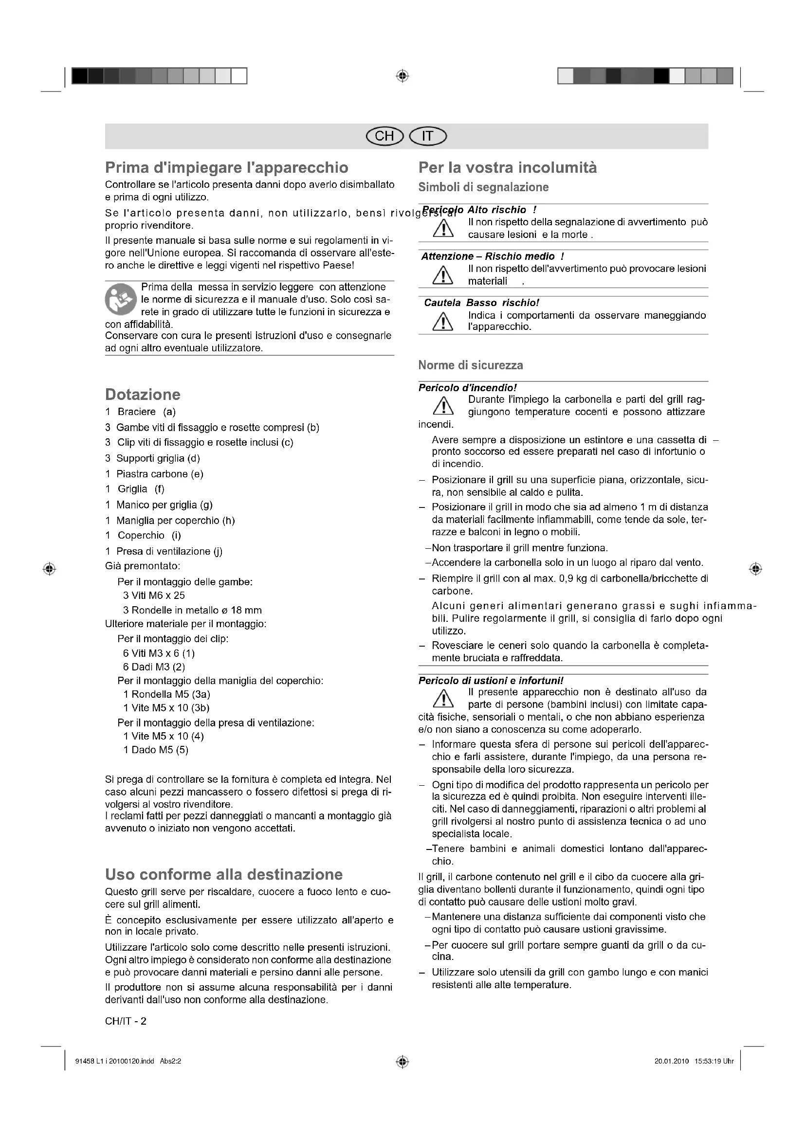 Clip viti di fissaggio e rosette inclusi (c) 3 Supporti griglia (d) 1 Piastra carbone (e) 1 Griglia (f) 1 Manico per griglia (g) 1 Maniglia per coperchio (h) 1 Coperchio (i) 1 Presa di ventilazione (j) Già premontato: Per il montaggio delle gambe: 3 Viti M6 x 25 3 Rondelle in metallo ø 18 mm Ulteriore materiale per il montaggio: Per il montaggio dei clip: 6 Viti M3 x 6 (1) 6 Dadi M3 (2) Per il montaggio della maniglia del coperchio: 1 Rondella M5 (3a) 1 Vite M5 x 10 (3b) Per il montaggio della presa di ventilazione: 1 Vite M5 x 10 (4) 1 Dado M5 (5) Si prega di controllare se la fornitura è completa ed integra. Nel caso alcuni pezzi mancassero o fossero difettosi si prega di ri- volgersi al vostro rivenditore. I reclami fatti per pezzi danneggiati o mancanti a montaggio già avvenuto o iniziato non vengono accettati. Uso conforme alla destinazione Questo grill serve per riscaldare, cuocere a fuoco lento e cuo- cere sul grill alimenti. È concepito esclusivamente per essere utilizzato all'aperto e non in locale privato. Utilizzare l'articolo solo come descritto nelle presenti istruzioni. Ogni altro impiego è considerato non conforme alla destinazione e può provocare danni materiali e persino danni alle persone. Il produttore non si assume alcuna responsabilità per i danni derivanti dall'uso non conforme alla destinazione. Per la vostra incolumità Simboli di segnalazione Pericolo Alto rischio ! Il non rispetto della segnalazione di avvertimento può causare lesioni e la morte . Attenzione – Rischio medio ! Il non rispetto dell'avvertimento può provocare lesioni materiali . Cautela Basso rischio! Indica i comportamenti da osservare maneggiando l'apparecchio. Norme di sicurezza Pericolo d'incendio! Durante l'impiego la carbonella e parti del grill rag- giungono temperature cocenti e possono attizzare incendi. Avere sempre a disposizione un estintore e una cassetta di – pronto soccorso ed essere preparati nel caso di infortunio o di incendio. Posizionare il grill su una superficie piana, orizzontale, sicu- – ra, non sensibile al caldo e pulita. Posizionare il grill in modo che sia ad almeno 1 m di distanza – da materiali facilmente infiammabili, come tende da sole, ter- razze e balconi in legno o mobili. Non trasportare il grill mentre funziona. – Accendere la carbonella solo in un luogo al riparo dal vento. – Riempire il grill con al max. 0,9 kg di carbonella/bricchette di – carbone. Alcuni generi alimentari generano grassi e sughi infiamma- – bili. Pulire regolarmente il grill, si consiglia di farlo dopo ogni utilizzo. Rovesciare le ceneri solo quando la carbonella è completa- – mente bruciata e raffreddata. Pericolo di ustioni e infortuni! Il presente apparecchio non è destinato all'uso da parte di persone (bambini inclusi) con limitate capa- cità fisiche, sensoriali o mentali, o che non abbiano esperienza e/o non siano a conoscenza su come adoperarlo. Informare questa sfera di persone sui pericoli dell'apparec- – chio e farli assistere, durante l'impiego, da una persona re- sponsabile della loro sicurezza. Ogni tipo di modifica del prodotto rappresenta un pericolo per – la sicurezza ed è quindi proibita. Non eseguire interventi ille- citi. Nel caso di danneggiamenti, riparazioni o altri problemi al grill rivolgersi al nostro punto di assistenza tecnica o ad uno specialista locale. Tenere bambini e animali domestici lontano dall'apparec- – chio. Il grill, il carbone contenuto nel grill e il cibo da cuocere alla gri- glia diventano bollenti durante il funzionamento, quindi ogni tipo di contatto può causare delle ustioni molto gravi. Mantenere una distanza sufficiente dai componenti visto che – ogni tipo di contatto può causare ustioni gravissime. Per cuocere sul grill portare sempre guanti da grill o da cu- – cina. Utilizzare solo utensili da grill con gambo lungo e con manici – resistenti alle alte temperature. 91458 L1 i 20100120.indd Abs2:291458 L1 i 20100120.indd Abs2:2 20.01.2010 15:53:19 Uhr20.01.2010 15:53:19 UhrCH/IT - 3 ITCH Non indossare indumenti con maniche larghe. – Utilizzare solo accenditori secchi o speciali accenditori liquidi – per grill in conformità alla norma EN 1860-3 come accendi- fuoco. Prima di pulire o metter via il grill, farlo raffreddare del tutto. – Pericolo d'esplosione! Se versati nella brace, i liquidi infiammabili formano fiammate o esplosioni a breve detonazione. Non utilizzare mai accendifuoco liquidi come benzina o spi- – rito. Non mettere sulla brace neanche pezzi di carbonella impre- – gnati di accendifuoco liquidi. Pericolo di avvelenamento! Nel bruciare carbonella, bricchette da grill ecc. si forma monossido di carbonio. Questo gas è inodore può essere mortale in locali chiusi! Utilizzare il grill solo all'aperto. – Pericolo Pericoli per bambini! Giocando, i bambini possono impigliarsi e soffocare nell'involucro di imballaggio. Non permettere ai bambini di giocare con l'involucro di im- – ballaggio. Fare attenzione che i bambini non mettano in bocca dei pezzi – per il montaggio. Potrebbero ingoiarli e quindi soffocare. Pericolo Pericolo di lesioni Al grill e a singole parti vi sono, in parte, spigoli vivi. Maneggiare con cautela le singole parti del grill, in modo da – poter evitare lesioni durante il montaggio ed il funzionamento. Se necessario, portare guanti protettivi. Non posizionare il grill vicino ad ingressi o in zone molto traf- – ficate. Durante la cottura sul grill si essere sempre molto scrupolosi. – Nel caso veniste distratti potreste perdere il controllo dell'ap- parecchio. Restare sempre sull'attenti e fare attenzione a quello che si – fa. Non utilizzare il prodotto se non siete concentrati o se siete stanchi e/o sotto l'influsso di droghe, alcol o medicine. Anche un piccolo momento di disattenzione durante l'uso del prodotto può causare lesioni gravi. Montaggio Preliminari Pericolo Pericolo di lesioni! L'inosservanza delle istruzioni può causare problemi e pericol
