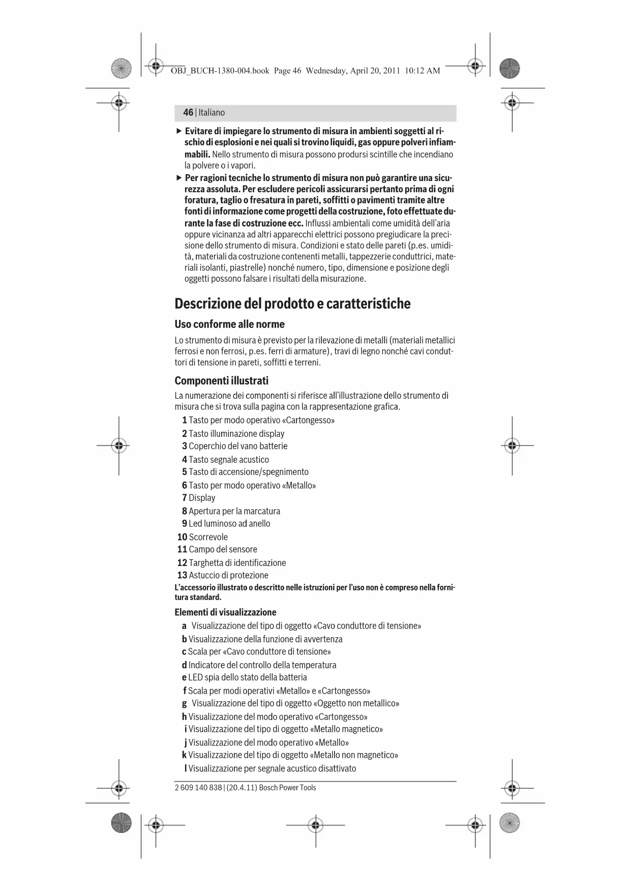 è sporco. Pulire lo strumento di misura con un panno asciutto e morbido e av- viare di nuovo l’operazione di misurazione. OBJ_BUCH-1380-004.book Page 49 Wednesday, April 20, 2011 10:12 AM50 | Italiano 2 609 140 838 | (20.4.11) Bosch Power Tools Se nel modo operativo «Cartongesso» compare in una posizione di misurazione alternativamente la visualizzazione k (metallo non magnetico) oppure i (metallo magnetico), è necessario passare nel modo operativo «Metallo» che è più adat- to ad individuare ed a distinguere oggetti magnetici ed oggetti non magnetici. Metallo Il modo operativo «Metallo» è adatto per individuare oggetti magnetici e non ma- gnetici nonché cavi conduttori di tensione (indipendentemente dallo stato della parete). Premere il tasto 6 per attivare il modo operativo «Metallo». L’anello luminoso 9 è illuminato in verde e la visualizzazione j è illuminata. Se l’oggetto metallico individuato è di un metallo magnetico (p.es. ferro), sul di- splay 7 viene visualizzato il simbolo i. In caso di metalli non magnetici viene visua- lizzato il simbolo k. Per la distinzione tra i tipi di metalli, lo strumento di misura deve trovarsi sopra l’oggetto metallico trovato (l’anello 9 è illuminato in rosso). Nota bene: In caso di armature d’acciaio da costruzione nel settore di controllo viene visualizzata sopra l’intera superficie una deviazione nella scala f. Tipica- mente in caso di armature d’acciaio da costruzione, direttamente sopra le barre di ferro viene visualizzato sul display il simbolo i per metalli magnetici, tra le bar- re di ferro compare il simbolo k per metalli non magnetici. Rilevazione di cavi conduttori di tensione Cavi conduttori di tensione vengono visualizzati in ogni modo operativo. Se viene individuato un cavo conduttore di tensione, compare sul display 7 la vi- sualizzazione a e la scala c. Muovere ripetutamente lo strumento di misura sopra il settore di controllo per localizzare in modo più preciso il cavo conduttore di tensione. Dopo ripetuti passaggi, il cavo conduttore di tensione può essere vi- sualizzato in modo molto preciso. Quando lo strumento di misura è molto vicino al cavo, l’anello luminoso 9 lampeggia in rosso ed il segnale acustico viene emes- so con sequenza di suoni più veloce. Nota: – Cavi conduttori di tensione possono essere individuati più facilmente se le utenze di corrente (p. es. lampade, apparecchi) vengono collegate ed inserite al cavo da individuare. – In determinate condizioni (come p.es. dietro superfici metalliche oppure dietro superfici con elevato contenuto di acqua), i cavi conduttori di ten- sione non possono essere rilevati in modo sicuro. L’intensità del segnale di un cavo conduttore di tensione dipende dalla lunghezza del cavo stesso. Per questa ragione controllare tramite ulteriori misurazioni nell’ambiente più vici- no o altri fonti di informazione se è presente un cavo conduttore di tensione. – Cavi non conduttori di tensione possono essere individuati come oggetti me- tallici nel modo operativo «Metallo». In questo modo operativo i cavetti non vengono visualizzati (contrariamente ai cavi pieni). – L’elettricità statica può causare una visualizzazione imprecisa dei cavi, p.es. in un grande settore. Per migliorare la visualizzazione appoggiare il palmo del- la mano libera sulla parete vicino allo strumento di misura per eliminare l’elet- tricità statica. Indicazioni operative f In linea di massima i risultati di misurazione possono venire condizionati da determinate condizioni ambientali. A queste appartengono p.es. la vi- cinanza di apparecchi che generano forti campi magnetici oppure elet- tromagnetici, umidità, materiali da costruzione contenenti metalli, ma- teriali isolanti accoppiati con alluminio e tappezzerie e piastrelle conduttrici. Per questa ragione osservare prima di forare, tagliare o fresare in pareti, soffitti o pavimenti anche altre fonti di informazioni (p.es. progetti di costruzione). OBJ_BUCH-1380-004.book Page 50 Wednesday, April 20, 2011 10:12 AMItaliano | 51 Bosch Power Tools 2 609 140 838 | (20.4.11) Marcatura di oggetti In caso di necessità è possibile contrassegnare gli oggetti localizzati. Misurare come d’abitudine. Se sono stati individuati i bordi oppure il centro di un oggetto, marcare il punto cercato attraverso l’apertura per la marcatura 8. Sensore della temperatura Lo strumento di misura è dotato di un controllo della temperatura poiché una misurazione esatta è possibile solamente fintanto che la temperatura all’interno dello strumento di misura rimane costante. Se l’indicatore del controllo della temperatura d si illumina significa che lo stru- mento di misura si trova al di fuori della temperatura d’esercizio oppure che era sottoposto ad elevate variazioni di temperatura. Spegnere lo strumento di mi- sura e lasciarlo adattare alla temperatura ambientale prima di metterlo di nuovo in funzione. Funzione di avvertenza Se sul display è illuminata la visualizzazione b è necessario avviare di nuovo la mi- surazione. Togliere lo strumento di misura dalla parete ed applicarlo in un altro punto sul settore da controllare. Se sul display 7 lampeggia la visualizzazione b inviare lo strumento di misura, nell’astuccio di protezione fornito in dotazione, ad un punto di assistenza auto- rizzato. Calibratura successiva Se nel modo operativo «Metallo» la scala f devia continuamente nonostante non vi sia alcun oggetto di metallo nelle vicinanze dello strumento di misura, è possi- bile calibrare manualmente lo strumento di misura. – Spegnere lo strumento di misura. – Rimuovere tutti gli oggetti nelle vicinanze dello strumento di misura che potrebbero essere visualizzati, anche orologio da polso o anelli in metallo, e tenere lo strumento di misura in aria. Prestare attenzione affinché l’indicatore della batteria e indichi ancora almeno 1/3 di autonomia: Tenere lo strumento di misura in modo tale che la targhetta di identific