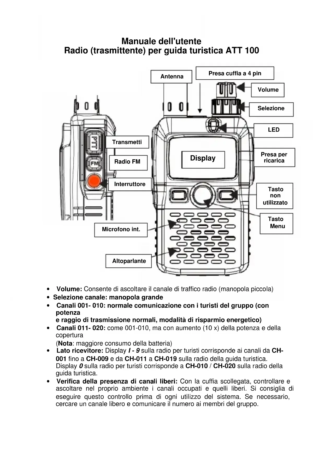 Funzioni addizionali della radio (non necessariamente per guide turistiche) Uso come walkie talkie tra le guide turistiche Senza aver collegato la cuffia, ATT 100 è una normale radio ricetrasmittente sulla gamma di frequenza UHF PMR 446 per comunicazioni interne. (La cuffia collegata non consente la ricezione perché l'auricolare può essere utilizzato solo per la riproduzione di MP3). Comunicare con le altre guide turistiche utilizzando il PTT e il microfono interni e l'altoparlante. Verificare che tutte le radio utilizzate per la comunicazione siano sintonizzate sullo stesso canale. Ricezione di altre trasmissioni radio Con l'ATT 100 è anche possibile ricevere stazioni radio FM (solo attraverso l'altoparlante interno). Attivazione: Premere per 2 secondi il tasto FM situato sul lato sinistro. La radio riceverà stazioni radio FM e mostrerà una tipica frequenza radio, ad es. 88.0 MHz. Utilizzare la manopola esterna (selettore canali) per selezionare le stazioni radio. I segnali a due vie della ricetrasmittente hanno la priorità. Appena viene ricevuto un segnale oppure appena viene premuto il tasto PTT, la radio tornerà all'ultimo canale di comunicazione utilizzato. Funzioni aggiuntive tramite tasto Menu (tasto centrale) Dopo aver premuto il tasto Menu, ulteriori funzioni possono essere selezionate con la manopola di selezione dei canali. Codice TX e codice TX Mostra i codici CTCSS / DCS attualmente in uso – Modifiche sono possibili solo kit di programmazione via PC. SQL Mostra le impostazioni per il livello del silenziatore (squelch). Sono selezionabili valori tra 0 (aperto, è possibile ascoltare tutto sul canale, compresi i rumori si fondo) e 4 (squelch completamente chiuso). Per l'uso come guida turistica consigliamo di selezionare valori non inferiori a 2. BCLO Busy Channel Lock Out – Blocco trasmissione su canale occupato Normalmente = off (disattivo). In futuro, le autorità normative intendono richiedere il controllo del canale prima di parlare ("Listen before talk, LBT, ovvero "ascolta prima di parlare"). Se BCLO è attivo non sarà possibile trasmettere fino a quando il canale selezionato è utilizzato da qualcun altro. Impostazione di fabbrica: BCLO OFF (disattivo). ILLUMINAZIONE Retroilluminazione attiva/disattiva (automaticamente oppure sempre attiva. impostazione consigliata: OFF (disattiva).SALVA Circuito di risparmio batteria. Deve essere attivo (ON). K TONE Segnalazione acustica quando viene premuto un tasto attiva/disattiva. Impostazione consigliata: OFF (disattivo) APO (Auto Power Off) Spegnimento automatico quando la radio non è utilizzata per un determinato arco di tempo. Impostazione consigliata: OFF (disattivo) TOT (Impostazione consigliata: OFF) Time-Out-Timer: tempo massimo consentito per la trasmissione. Disattiva il trasmettitore dopo il tempo di trasmissione selezionato. Per continuare a trasmettere è necessario premere brevemente una volta il tasto PTT, prima di poter avviare un nuovo periodo di trasmissione. VOX (Impostazione consigliata: OFF) Controllo automatico della voce (vivavoce). Selezioni: OFF-1,2,3,4. In posizione 4, il rilevatore vocale è impostato sulla massima sensibilità. Consigliamo di non utilizzare la funzione VOX, poiché richiede un processo di addestramento personale per imparare un modo di parlare che eviti la perdita di sillabe o parole all'inizio della trasmissione vocale. FM RET (impostazione consigliata: OFF) Riavvio automatico della trasmissione radio al termine delle comunicazioni radio. È sconsigliato l'uso per guide turistiche perché aumenta il consumo energetico (nessun risparmio energetico durante i periodi di silenzio!) Programmazione PC (solo per manutenzione) Un kit per la programmazione può essere collegato alla radio per consentire l'attivazione/disattivazione di determinate funzioni oltre a altre frequenze di canali nella gamma