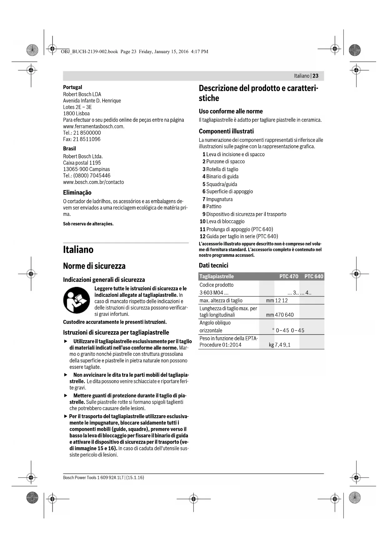 A roda de corte 3 empena/aos solavan- cos ao ranhurar A força de pressão ao ranhurar o ladrilho é muito elevada Exercer menos pressão ao ranhurar sobre a alavanca de ranhurar ou quebrar 1 OBJ_BUCH-2139-002.book Page 22 Friday, January 15, 2016 4:17 PMItaliano | 23 Bosch Power Tools 1 609 92A 1LT | (15.1.16) Portugal Robert Bosch LDA Avenida Infante D. Henrique Lotes 2E – 3E 1800 Lisboa Para efectuar o seu pedido online de peças entre na página www.ferramentasbosch.com. Tel.: 21 8500000 Fax: 21 8511096 Brasil Robert Bosch Ltda. Caixa postal 1195 13065-900 Campinas Tel.: (0800) 7045446 www.bosch.com.br/contacto Eliminação O cortador de ladrilhos, os acessórios e as embalagens de- vem ser enviados a uma reciclagem ecológica de matéria pri- ma. Sob reserva de alterações. Italiano Norme di sicurezza Indicazioni generali di sicurezza Leggere tutte le istruzioni di sicurezza e le indicazioni allegate al tagliapiastrelle. In caso di mancato rispetto delle indicazioni e delle istruzioni di sicurezza possono verificar- si gravi infortuni. Custodire accuratamente le presenti istruzioni. Istruzioni di sicurezza per tagliapiastrelle Utilizzare il tagliapiastrelle esclusivamente per il taglio di materiali indicati nell’uso conforme alle norme. Mar- mo o granito nonché piastrelle con struttura grossolana della superficie e piastrelle in pietra naturale non possono essere tagliate. Non avvicinare le dita tra le parti mobili del tagliapia- strelle. Le dita possono venire schiacciate e riportare feri- te gravi. Mettere guanti di protezione durante il taglio di pia- strelle. Sulle piastrelle rotte si formano spigoli taglienti che potrebbero causare delle lesioni. Per il trasporto del tagliapiastrelle utilizzare esclusiva- mente le impugnature, bloccare saldamente tutti i componenti mobili (guide, squadre), premere verso il basso la leva di bloccaggio per fissare il binario di guida e attivare il dispositivo di sicurezza per il trasporto (ve- di immagine 15 e 16). In caso di caduta dell'utensile sus- siste pericolo di lesioni. Descrizione del prodotto e caratteri- stiche Uso conforme alle norme Il tagliapiastrelle è adatto per tagliare piastrelle in ceramica. Componenti illustrati La numerazione dei componenti rappresentati si riferisce alle illustrazioni sulle pagine con la rappresentazione grafica. 1 Leva di incisione e di spacco 2 Punzone di spacco 3 Rotella di taglio 4 Binario di guida 5 Squadra/guida 6 Superficie di appoggio 7 Impugnatura 8 Pattino 9 Dispositivo di sicurezza per il trasporto 10 Leva di bloccaggio 11 Prolunga di appoggio (PTC 640) 12 Guida per taglio in serie (PTC 640) L’accessorio illustrato oppure descritto non è compreso nel volu-me di fornitura standard. L’accessorio completo è contenuto nel nostro programma accessori. Dati tecnici Tagliapiastrelle PTC 470 PTC 640 Codice prodotto 3 603 M04 ...