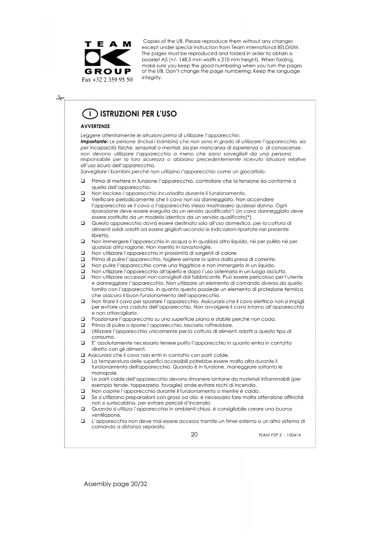 . Un cavo danneggiato deve essere sostituito da un modello identico da un servizio qualificato(*). Questo apparecchio dovrà essere destinato solo all’uso domestico, per la cottura di alimenti solidi adatti ad essere grigliati secondo le indicazioni riportate nel presente libretto. Non immergere l’apparecchio in acqua o in qualsiasi altro liquido, né per pulirlo né per qualsiasi altra ragione. Non inserirlo in lavastoviglie. Non utilizzare l’apparecchio in prossimità di sorgenti di calore. Prima di pulire l’apparecchio, togliere sempre la spina dalla presa di corrente. Non pulire l’apparecchio come una friggitrice e non immergerlo in un liquido. Non utilizzare l’apparecchio all'aperto e dopo l’uso sistemarlo in un luogo asciutto. Non utilizzare accessori non consigliati dal fabbricante. Può essere pericoloso per l’utente e danneggiare l’apparecchio. Non utilizzare un elemento di comando diverso da quello fornito con l’apparecchio, in quanto questo possiede un elemento di protezione termica che assicura il buon funzionamento dell’apparecchio. Non tirare il cavo per spostare l’apparecchio. Assicurarsi che il cavo elettrico non si impigli per evitare una caduta dell’apparecchio. Non avvolgere il cavo intorno all’apparecchio e non attorcigliarlo. Posizionare l’apparecchio su una superficie piana e stabile perché non cada. Prima di pulire o riporre l’apparecchio, lasciarlo raffreddare. Utilizzare l’apparecchio unicamente per la cottura di alimenti adatti a questo tipo di consumo. E’ assolutamente necessario tenere pulito l’apparecchio in quanto entra in contatto diretto con gli alimenti. Assicurarsi che il cavo non entri in contatto con parti calde. La temperatura delle superfici accessibili potrebbe essere molto alta durante il funzionamento dell'apparecchio. Quando è in funzione, maneggiare soltanto le manopole. Le parti calde dell’apparecchio devono rimanere lontane da materiali infiammabili (per esempio tende, tappezzeria, tovaglie) onde evitare rischi di incendio. Non coprire l’apparecchio durante il funzionamento o mentre è caldo. Se si utilizzano preparazioni con grassi od olio, è necessario fare molta attenzione affinchè non si surriscaldino, per evitare pericoli d’incendio. Quando si utilizza l’apparecchio in ambienti chiusi, è consigliabile creare una buona ventilazione. L’apparecchio non deve mai essere accesso tramite un timer esterno o un altro sistema di comando a distanza separato.Copies of the I/B. Please reproduce them without any changes except under special instruction from Team International BELGIUM. The pages must be reproduced and folded in order to obtain a booklet A5 (+/- 148.5 mm width x 210 mm height). When folding, make sure you keep the good numbering when you turn the pages of the I/B. Don’t change the page numbering. Keep the language integrity.
