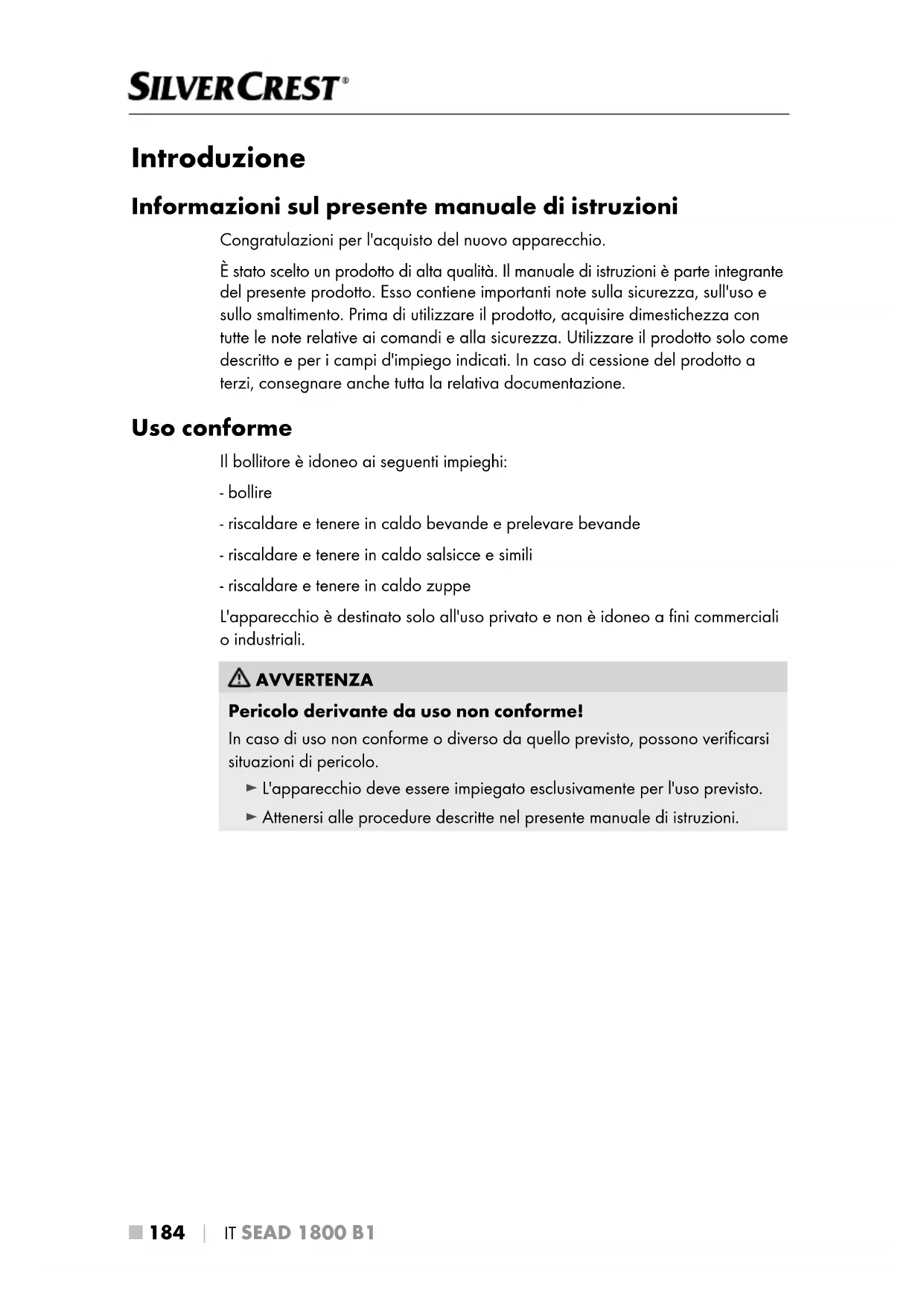 Introduzione Informazioni sul presente manuale di istruzioni Congratulazioni per l'acquisto del nuovo apparecchio. È stato scelto un prodotto di alta qualità. Il manuale di istruzioni è parte integrante del presente prodotto. Esso contiene importanti note sulla sicurezza, sull'uso e sullo smaltimento. Prima di utilizzare il prodotto, acquisire dimestichezza con tutte le note relative ai comandi e alla sicurezza. Utilizzare il prodotto solo come descritto e per i campi d'impiego indicati. In caso di cessione del prodotto a terzi, consegnare anche tutta la relativa documentazione. Uso conforme Il bollitore è idoneo ai seguenti impieghi: - bollire - riscaldare e tenere in caldo bevande e prelevare bevande - riscaldare e tenere in caldo salsicce e simili - riscaldare e tenere in caldo zuppe L'apparecchio è destinato solo all'uso privato e non è idoneo a fini commerciali o industriali. AVVERTENZA Pericolo derivante da uso non conforme! In caso di uso non conforme o diverso da quello previsto, possono verificarsi situazioni di pericolo. ► L'apparecchio deve essere impiegato esclusivamente per l'uso previsto. ► Attenersi alle procedure descritte nel presente manuale di istruzioni. IB_444431_SEAD1800B1_LB8.indb 184 23.10.2023 13:25:03IT