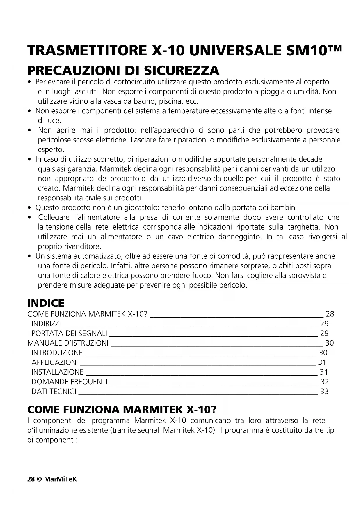 Congratulazioni per il Suo acquisto del Trasmettitore universale SM10 di segnali X-10 Marmitek. Il trasmettitore controlling, using la rete elettrica, gli apparecchi elettrici, gli elettrodomestici e le luci che sono collegati ai moduli X-10 Marmitek. Accende automaticamente tutte le luci (fisse o lampeggianti) quando scatta un allarme, perché che sia necessario stendere altri cavi. Accende apparecchi elettrici, elettrodomestici e luci da qualiasi punto della casa, perché bisogno di cablaggio aggiuntivo. L'SM10 più essere attivato da quasi tutti i segnali: alla chiusura a fatto (di relè, interrottore o pannello dell'impianto antifurto), maanche da qualiasi tensione tra i 6 e i 18 V (ad es. del trasformatatore del campanello o di un segnale acustico amplificato).
