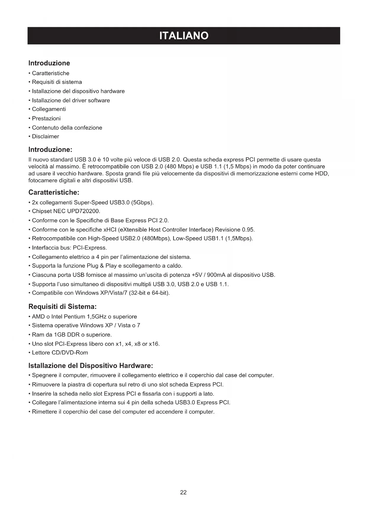 Collegamenti: Porte USB 3.0 Porte USB 3.0 Connettore Elettrico Interno Express Card PCI verso Slot26 Prestazione: 2,5 Gb 5,0 Gb USB 3.0 USB 3.0 5.0Gb 5.0Gb PCI- E Ver1.0/1.1 PCI- E Ver2.0 Scheda USB 3.0 Scheda USB 3.0 Dispositivi USB Dispositivi USB >150MB/ sec >300MB/ sec Si prega di usare lo slot PCI Express Ver 2.0 per ottenere il tasso di trasferimento dati USB 3.0 di 5.0Gbps. Contenuto della confezione: