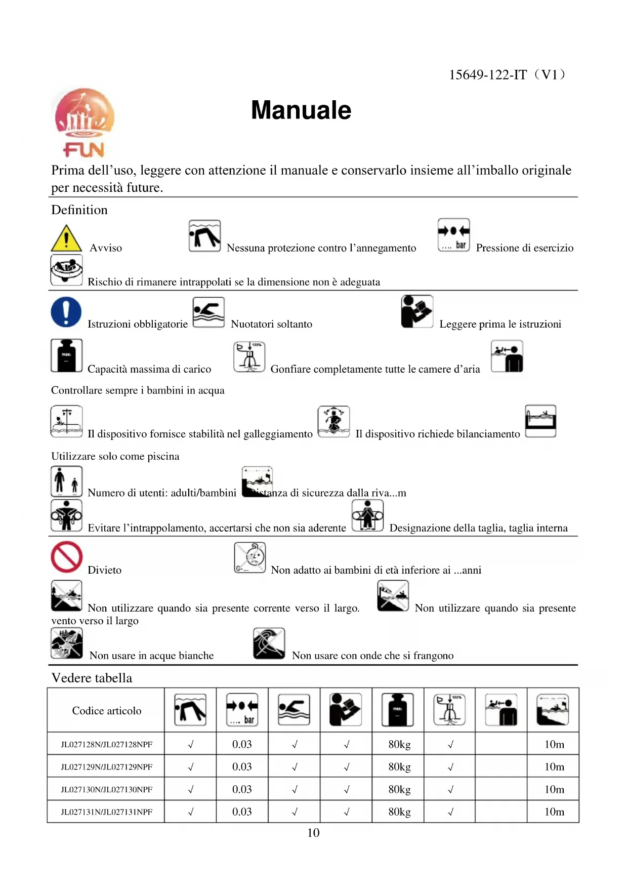 Prima dell’uso, leggere con attenzione il manuale e conservarlo insieme all’imballo originale per necessità future. Definition Avviso Nessuna protezione contro l’annegamento Pressione di esercizio Rischio di rimanere intrappolati se la dimensione non è adeguata Istruzioni obbligatorie Nuotatori soltanto Leggere prima le istruzioni Capacità massima di carico Gonfiare completamente tutte le camere d’aria Controllare sempre i bambini in acqua Il dispositivo fornisce stabilità nel galleggiamento Il dispositivo richiede bilanciamento Utilizzare solo come piscina Numero di utenti: adulti/bambini Distanza di sicurezza dalla riva...m Evitare l’intrappolamento, accertarsi che non sia aderente Designazione della taglia, taglia interna Divieto Non adatto ai bambini di età inferiore ai ...anni Non utilizzare quando sia presente corrente verso il largo. Non utilizzare quando sia presente vento verso il largo Non usare in acque bianche Non usare con onde che si frangono Vedere tabella Codice articolo