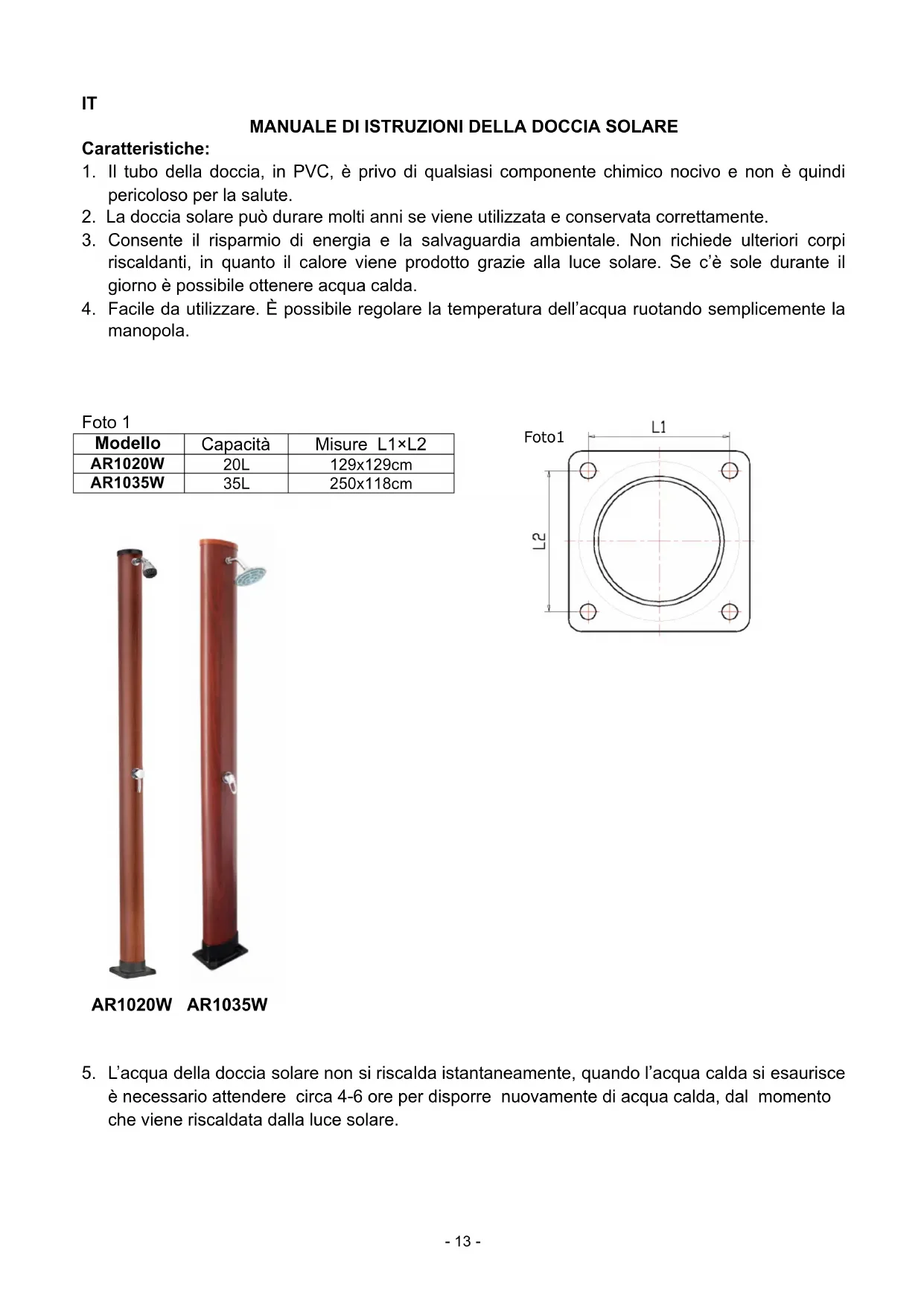 - L'acqua della doccia solare non si riscalda istantaneamente, quando l'acqua calda si esaurisce è necessario attendere circa 4-6 ore per disporre nuovamente di acqua calda, dal momento che viene riscaldata alla luce solare.