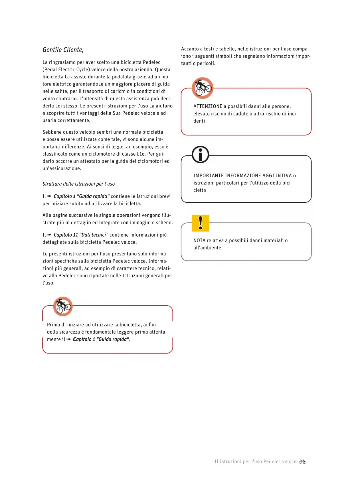 Capitolo 1 "Guida rapida". Accanto a testi e tabelle, nelle istruzioni per l'uso compa- iono i seguenti simboli che segnalano informazioni impor- tanti o pericoli. ATTENZIONE a possibili danni alle persone, elevato rischio di cadute o altro rischio di inci- denti IMPORTANTE INFORMAZIONE AGGIUNTIVA o istruzioni particolari per l'utilizzo della bici- cletta NOTA relativa a possibili danni materiali o all'ambiente4 II Istruzioni per l'uso Pedelec veloce