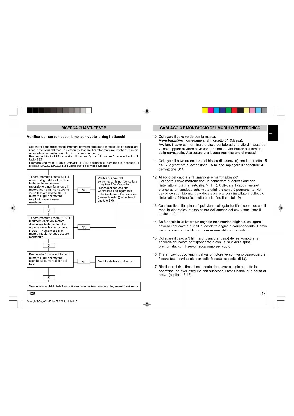 L’interruttore frizione spegne il regolatore di velocità. In caso contrario verificare i cavi e la distanza tra il magnete e il contatto reed (consultare il paragrafo 9.0 Montaggio interruttore frizione.). Tutti le operazioni di montaggio del MAGIC-SPEED sono concluse e la batteria è stata ricollegata. Eseguire i test nell’ordine Test A e poi Test B. Book_MS-50_A6.p65 10-02-2003, 11:14119120