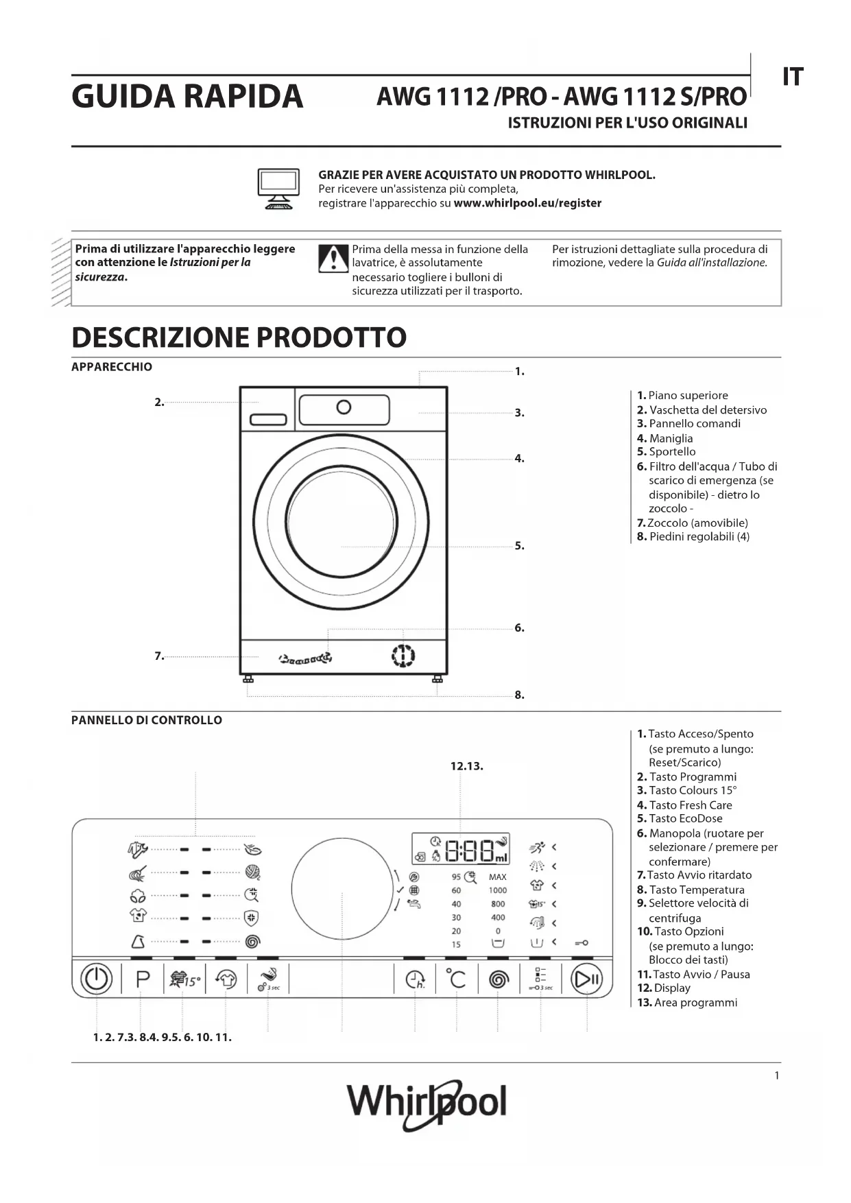 Prima di utilizzare l'apparecchio leggere con attenzione le Istruzioni per la sicurezza. Prima della messa in funzione della lavatrice, è assolutamente necessario togliere i bulloni di sicurezza utilizzati per il trasporto. Per istruzioni dettagliate sulla procedura di rimozione, vedere la Guida all'installazione.