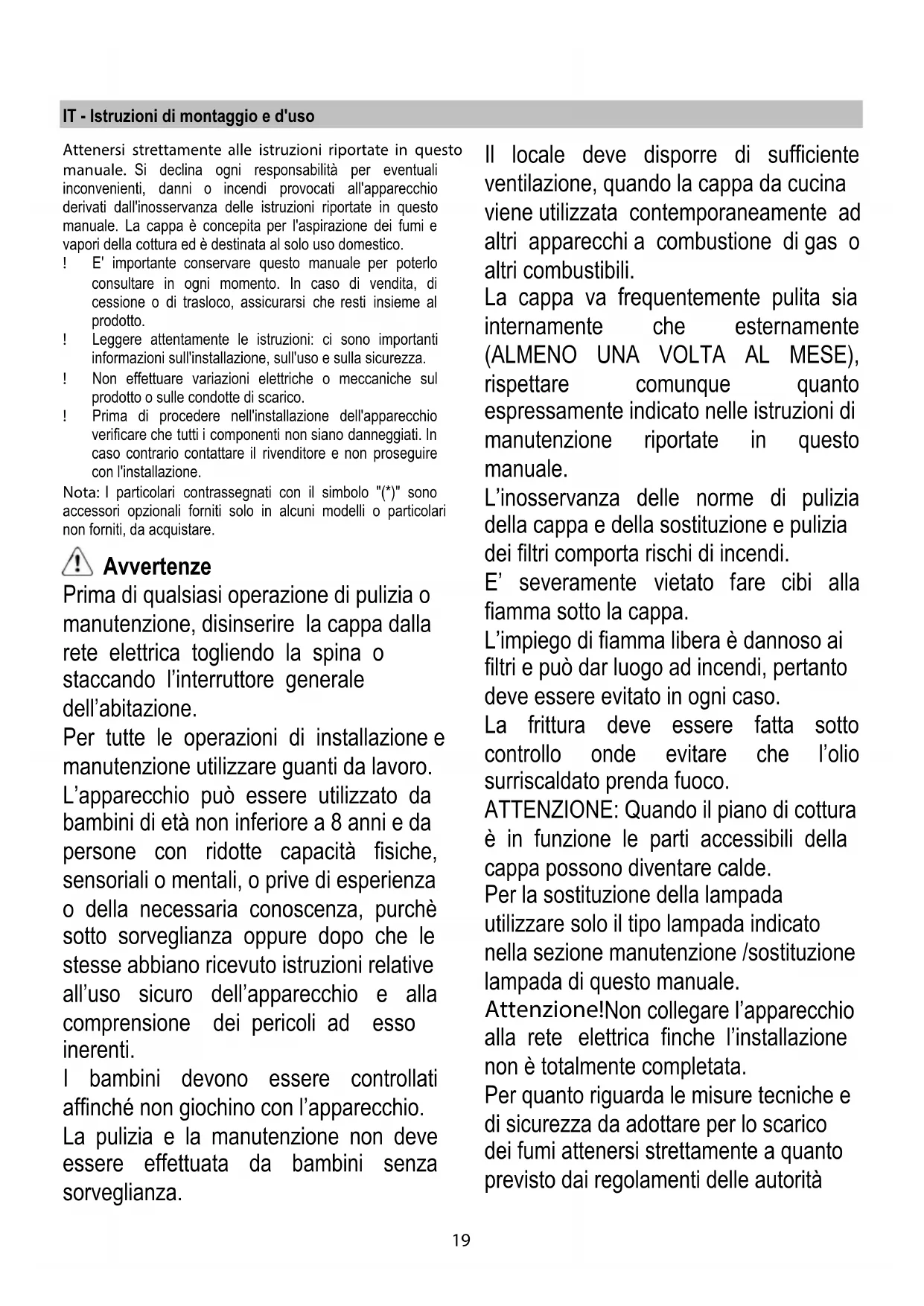 Werking De kap is voorzien van een bedieningspaneel met een schakelaar voor de snelheid van afzuiging en een schakelaar voor de verlichting van het fornuis. In geval van een sterkere dampconcentratie een hogere zuigkracht gebruiken. We raden aan de afzuigkap 5 minuten voordat men begint te koken aan te doen en deze nog voor ongeveer 15 minuten nadat men beëindigt heeft aan te laten.18 Onderhoud Schoonmaak Gebruik voor het reinigen UITSLUITEND een doek die u vochtig maakt met een beetje neutraal vloeibaar reinigingsmiddel. GEBRUIK GEEN GEREEDSCHAPPEN OF INSTRUMENTEN OM TE REINIGEN! Gebruik geen producten die schuurmiddelen bevatten. GEEN ALCOHOL GEBRUIKEN! Vetfilter Houdt de vetdeeltjes vast. Het metalen vetlter moet eenmaal per maand worden gereinigd met neutrale reinigingsmiddelen, met de hand of in de vaatwasmachine op lage temperaturen en met een kort programma. Door hem in de vaatwasmachine te wassen kan het metalen vetfilter ontkleuren, maar dit is niet van invloed op de eigenschappen, die beslist niet veranderen. Om het vetfilter te demonteren trekt u aan de veerbelaste ontgrendelingshandgreep. afb. 1 Koolstoffilter (alleen voor filterend apparaat) afb. 2 Houdt de lastige kookgeuren vast. De verzadiging van de koolstolter vindt plaats na een min of meer langdurig gebruik en hangt af van de manier waarop wordt gekook en de regelmaat waarmee de vetfilter wordt gewassen. In ieder geval moet de filter minstens om de 4 maanden vervangen worden. Het kan NIET gewassen of opnieuw gebruikt worden Verwijder de vetfilter(s). Monteer de filters ter afdekking van de motor. Controleer of de pinnen R op het kanaal overeenkomen met de openingen S ; draai vervolgens naar rechts tot het vergrendeld is. Ga voor demontage in omgekeerde volgorde te werk. Breng de vetfilter(s) weer aan. Vervanging lampjes afb. 1 Sluit de stroom af. Attentie! Alvorens de lampjes aan te raken controleer eerst of ze koud zijn. Vervang het beschadigde lampje met een lampje van hetzelfde soort zoals aangegeven op het typeplaatje of op het apparaat zelf in de buurt van het lampje. Om de lampehouder te bereiken verwijder de afdekking A. Als de verlichting niet werkt, controleer dan of de lampjes goed op hun plaats zitten alvorens de assistentiedienst te bellen.19 IT - Istruzioni di montaggio e d'uso Attenersi strettamente alle istruzioni riportate in questo manuale. Si declina ogni responsabilità per eventuali inconvenienti, danni o incendi provocati all'apparecchio derivati dall'inosservanza delle istruzioni riportate in questo manuale. La cappa è concepita per l'aspirazione dei fumi e vapori della cottura ed è destinata al solo uso domestico. ! E' importante conservare questo manuale per poterlo consultare in ogni momento. In caso di vendita, di cessione o di trasloco, assicurarsi che resti insieme al prodotto. ! Leggere attentamente le istruzioni: ci sono importanti informazioni sull'installazione, sull'uso e sulla sicurezza. ! Non effettuare variazioni elettriche o meccaniche sul prodotto o sulle condotte di scarico. ! Prima di procedere nell'installazione dell'apparecchio verificare che tutti i componenti non siano danneggiati. In caso contrario contattare il rivenditore e non proseguire con l'installazione. Nota: I particolari contrassegnati con il simbolo "(*)" sono accessori opzionali forniti solo in alcuni modelli o particolari non forniti, da acquistare. Avvertenze Prima di qualsiasi operazione di pulizia o manutenzione, disinserire la cappa dalla rete elettrica togliendo la spina o staccando l’interruttore generale dell’abitazione. Per tutte le operazioni di installazione e manutenzione utilizzare guanti da lavoro. L’apparecchio può essere utilizzato da bambini di età non inferiore a 8 anni e da persone con ridotte capacità fisiche, sensoriali o mentali, o prive di esperienza o della necessaria conoscenza, purchè sotto sorveglianza oppure dopo che le stesse abbiano ricevuto istruzioni relative all’uso sicuro dell’apparecchio e alla comprensione dei pericoli ad esso inerenti. I bambini devono essere controllati affinché non giochino con l’apparecchio. La pulizia e la manutenzione non deve essere effettuata da bambini senza sorveglianza. Il locale deve disporre di sufficiente ventilazione, quando la cappa da cucina viene utilizzata contemporaneamente ad altri apparecchi a combustione di gas o altri combustibili. La cappa va frequentemente pulita sia internamente che esternamente (ALMENO UNA VOLTA AL MESE), rispettare comunque quanto espressamente indicato nelle istruzioni di manutenzione riportate in questo manuale. L’inosservanza delle norme di pulizia della cappa e della sostituzione e pulizia dei filtri comporta rischi di incendi. E’ severamente vietato fare cibi alla fiamma sotto la cappa. L’impiego di fiamma libera è dannoso ai filtri e può dar luogo ad incendi, pertanto deve essere evitato in ogni caso. La frittura deve essere fatta sotto controllo onde evitare che l’olio surriscaldato prenda fuoco. ATTENZIONE: Quando il piano di cottura è in funzione le parti accessibili della cappa possono diventare calde. Per la sostituzione della lampada utilizzare solo il tipo lampada indicato nella sezione manutenzione /sostituzione lampada di questo manuale. Attenzione! Non collegare l’apparecchio alla rete elettrica finche l’installazione non è totalmente completata. Per quanto riguarda le misure tecniche e di sicurezza da adottare per lo scarico dei fumi attenersi strettamente a quanto previsto dai regolamenti delle autorità20 locali competenti. L’aria aspirata non deve essere convogliata in un condotto usato per lo scarico dei fumi prodotti da apparecchi a combustione di gas o di altri combustibili. Non utilizzare o lasciare la cappa priva di lampade correttamente montate per possibile rischio di scossa elettrica. Mai utilizzare la cappa senza griglia correttamente montata! La cappa non va MAI utilizzata come piano di appoggio a meno che non sia espressamente indicato. Utilizzare