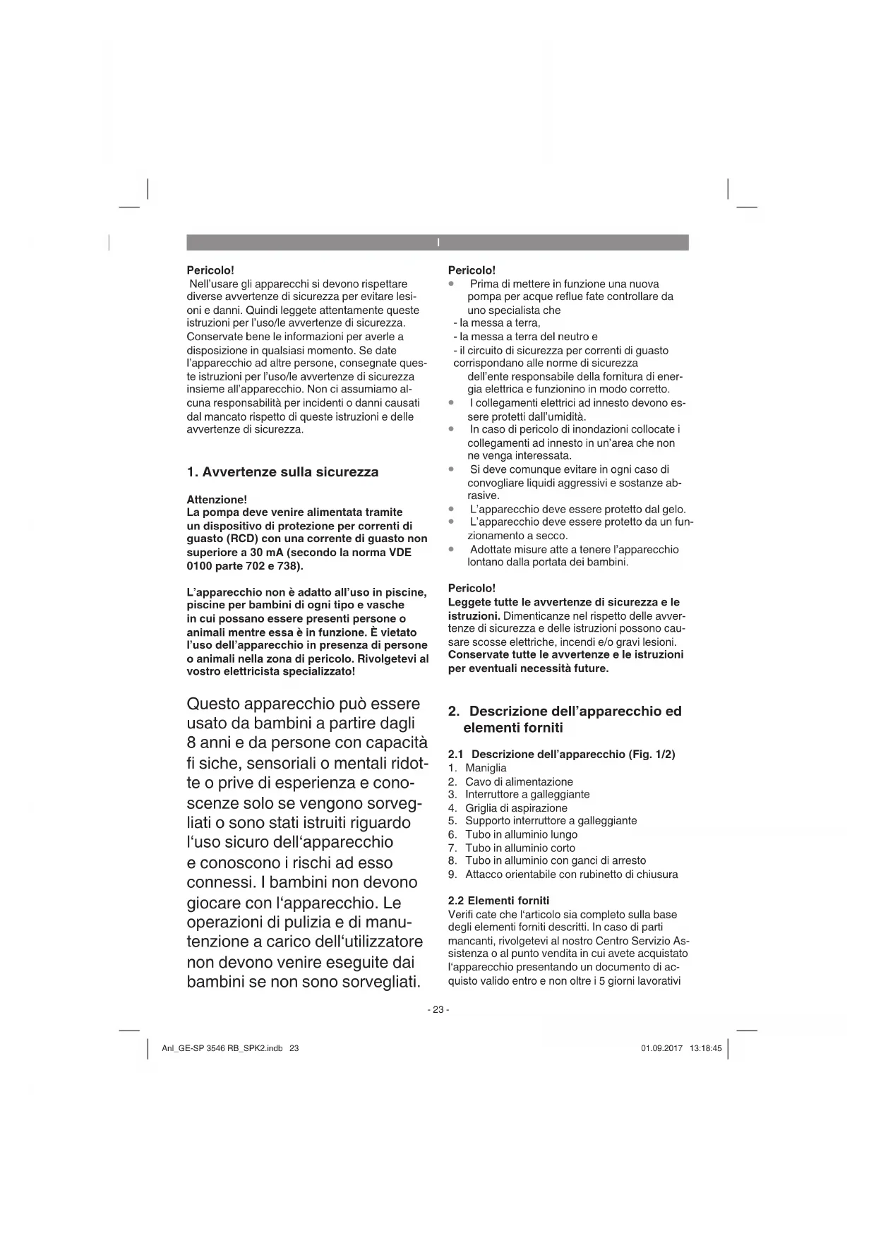 Attenzione! La pompa deve venire alimentata tramite un dispositivo di protezione per correnti di guasto (RCD) con una corrente di guasto non superiore a 30 mA (secondo la norma VDE 0100 parte 702 e 738). L’apparecchio non è adatto all’uso in piscine, piscine per bambini di ogni tipo e vasche in cui possano essere presenti persone o animali mentre essa è in funzione. È vietato l’uso dell’apparecchio in presenza di persone o animali nella zona di pericolo. Rivolgetevi al vostro elettricista specializzato! Questo apparecchio può essere usato da bambini a partire dagli 8 anni e da persone con capacità fi siche, sensoriali o mentali ridot- te o prive di esperienza e cono- scenze solo se vengono sorveg- liati o sono stati istruiti riguardo l‘uso sicuro dell‘apparecchio e conoscono i rischi ad esso connessi. I bambini non devono giocare con l‘apparecchio. Le operazioni di pulizia e di manu- tenzione a carico dell‘utilizzatore non devono venire eseguite dai bambini se non sono sorvegliati. Pericolo!