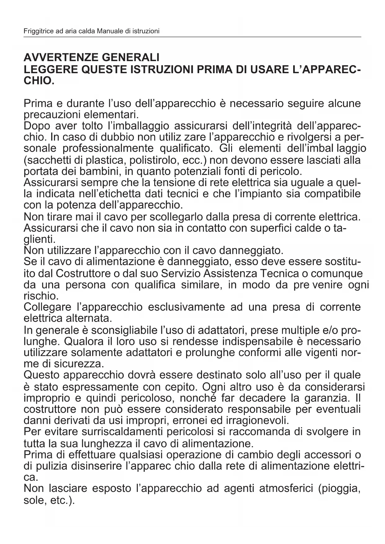 L'élenco di cui sopra è a titolo meramente esemplificativo e non ESAustivo, in quanto la presente garanzia è comunque esclusa per tutte nelle circostanze che non possono farsi risalire a difetti di fabbricazione dell'apparecchio.
