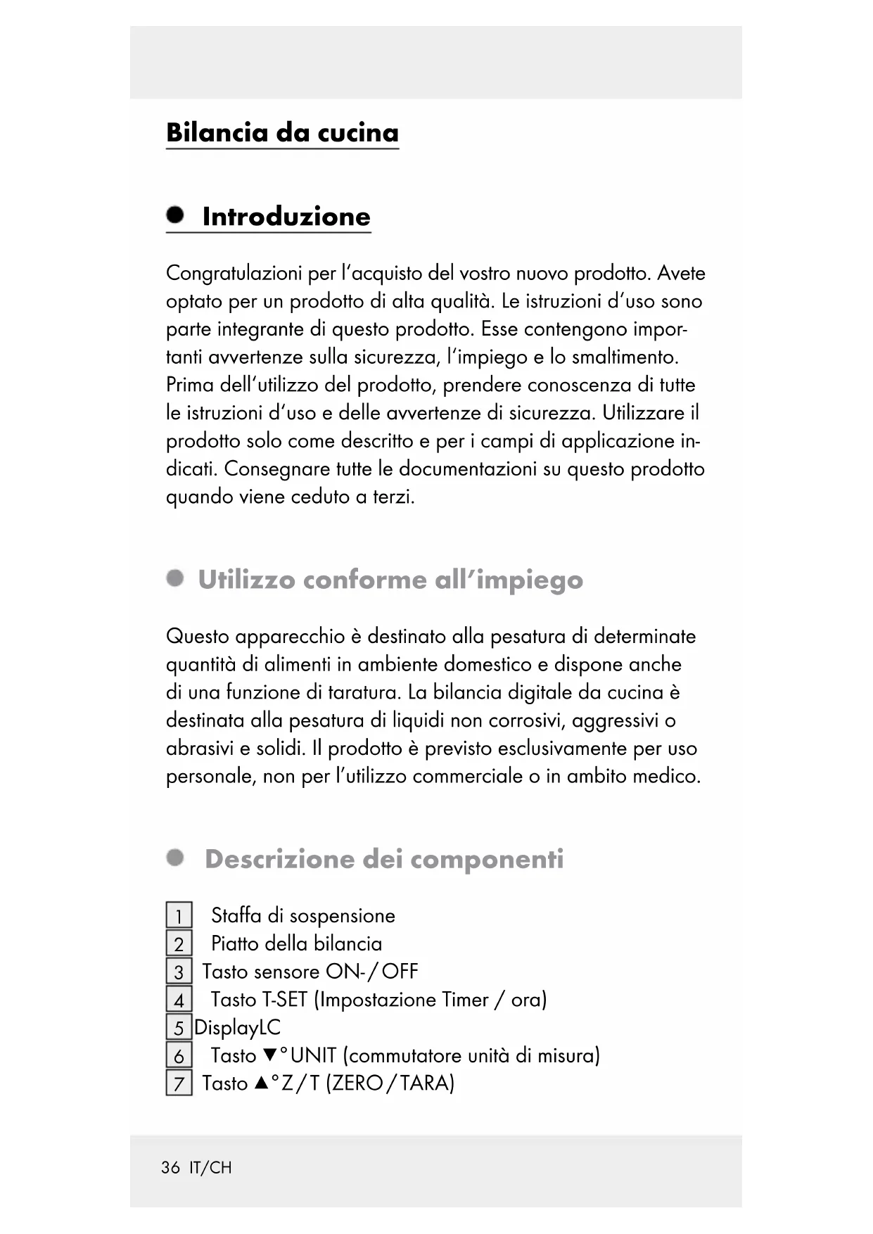 DEI BAMBINI! Non lasciare mai i38 IT/CH bambini incustoditi con il materiale per imballaggio. Sussiste un pericolo di soffocamento a causa di tale materiale. Spesso, i bambini sottovalutano i peri- coli. Tenere il materiale per imballaggio sempre fuori della portata dei bambini. PERICOLO DI MORTE! L’eventuale ingestione di batte- rie può rappresentare un pericolo mor- tale. Qualora una batteria sia stata ingerita, chiedere subito l’intervento di un medico. Quest‘apparecchio può essere utiliz- zato da bambini di età superiore agli 8 anni, da persone con capacità fisiche, sensoriali o mentali ridotte o da persone inesperte solo se supervisionate o pre- ventivamente istruite sull’utilizzo in sicu- rezza del prodotto e solo se informate dei pericoli legati al prodotto stesso. Non lasciare che i bambini giochino con l‘apparecchio. La pulizia e la manu- tenzione non devono essere eseguite dai bambini senza supervisione.39 IT/CH 5 kg ATTENZIONE! Non caricare la bilancia con un peso supe- riore ai 5 kg. Il prodotto potrebbe venire danneggiato. Evita cariche / scariche elettrostatiche. Queste possono causare un impedi- mento dello scambio di dati interni e quindi generare errori nel display LC. Prima dell’uso, controllare che il prodotto non sia danneggiato. Non mettete in nessun caso in funzione un apparecchio danneggiato. Non aprire mai l‘alloggiamento del prodotto. Ciò potrebbe portare a pericolo di lesioni e / o danni al prodotto. Fare eseguire eventuali ri- parazioni solamente da un elettricista. Assicurarsi che tutti gli utilizzatori del prodotto abbiano letto le istruzioni e siano in grado di utilizzare il prodotto in modo sicuro. Posizionare l’apparecchio su una base piana, stabile e orizzontale. Le funzioni del prodotto potrebbero essere disattivate a causa dalle40 IT/CH interferenze magnetiche. In questo caso, rimuovere le batterie per un tempo breve e reinserirle. IDONEO PER ALIMENTI! Le caratteristiche del sapore e dell‘odore non vengono pregiudicate mediante questo prodotto. Avvertenze di sicurezza per le batterie Rimuovere le batterie dall’apparecchio se non vengono utilizzate per molto tempo.