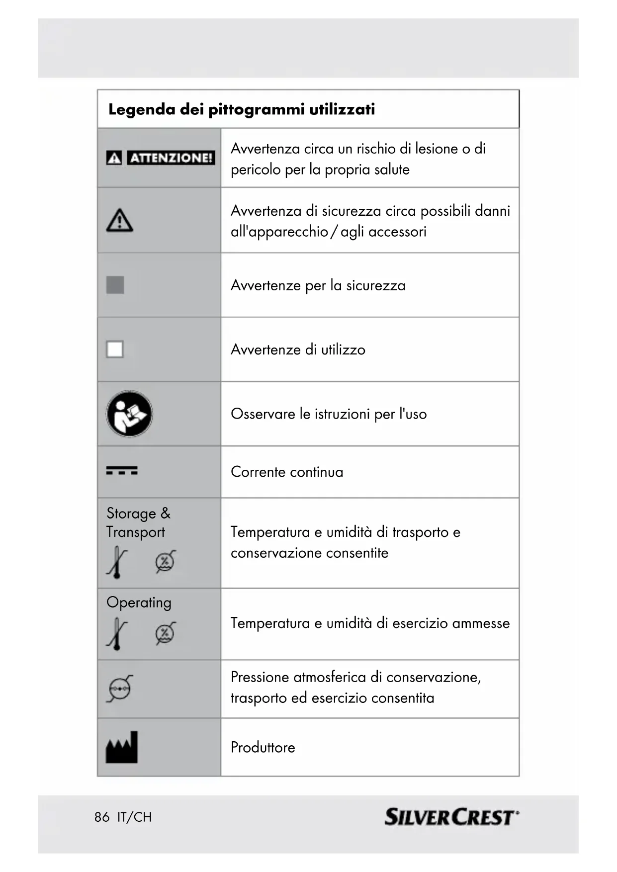 ..................................................................... Pagina 104 Valutare i valori di misurazione .........................Pagina 106 Classificazione dei risultati di misurazione ................Pagina 107 Salvataggio, lettura e cancellazione dei valori misurati ............................................................Pagina 108 Pulizia e cura ............................................................... Pagina 110 Conservazione ............................................................ Pagina 110 Risoluzione dei problemi .......................................Pagina 111 Smaltimento ................................................................Pagina 112 Garanzia / Assistenza .............................................. Pagina 11386 IT/CH Legenda dei pittogrammi utilizzati Avvertenza circa un rischio di lesione o di pericolo per la propria salute Avvertenza di sicurezza circa possibili danni all'apparecchio / agli accessori Avvertenze per la sicurezza Avvertenze di utilizzo Osservare le istruzioni per l'uso Corrente continua Storage & Transport Temperatura e umidità di trasporto e conservazione consentite Operating Temperatura e umidità di esercizio ammesse Pressione atmosferica di conservazione, trasporto ed esercizio consentita Produttore87 IT/CH Componente di impiego di tipo BF Numero di serie