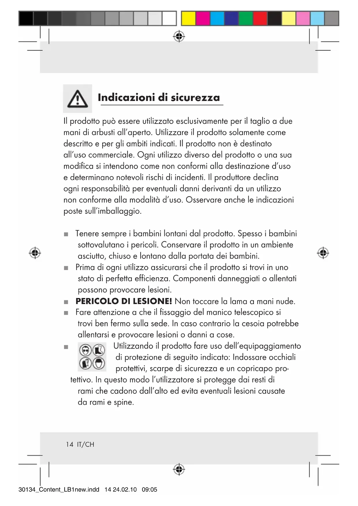 Mise au rebut L’emballage se compose de matières recyclables qui peuvent être mises au rebut dans les déchetteries locales. Renseignez-vous auprès de votre mairie ou de l’administration muni- cipale concernant les possibilités de mise au rebut des produits usés. 30134_Content_LB1new.indd 13 24.02.10 09:0514 IT/CH Indicazioni di sicurezza Il prodotto può essere utilizzato esclusivamente per il taglio a due mani di arbusti all’aperto. Utilizzare il prodotto solamente come descritto e per gli ambiti indicati. Il prodotto non è destinato all’uso commerciale. Ogni utilizzo diverso del prodotto o una sua modifica si intendono come non conformi alla destinazione d’uso e determinano notevoli rischi di incidenti. Il produttore declina ogni responsabilità per eventuali danni derivanti da un utilizzo non conforme alla modalità d’uso. Osservare anche le indicazioni poste sull’imballaggio. J Tenere sempre i bambini lontani dal prodotto. Spesso i bambini sottovalutano i pericoli. Conservare il prodotto in un ambiente asciutto, chiuso e lontano dalla portata dei bambini. J Prima di ogni utilizzo assicurarsi che il prodotto si trovi in uno stato di perfetta efficienza. Componenti danneggiati o allentati possono provocare lesioni. J PERICOLO DI LESIONE! Non toccare la lama a mani nude. J Fare attenzione a che il fissaggio del manico telescopico si trovi ben fermo sulla sede. In caso contrario la cesoia potrebbe allentarsi e provocare lesioni o danni a cose.