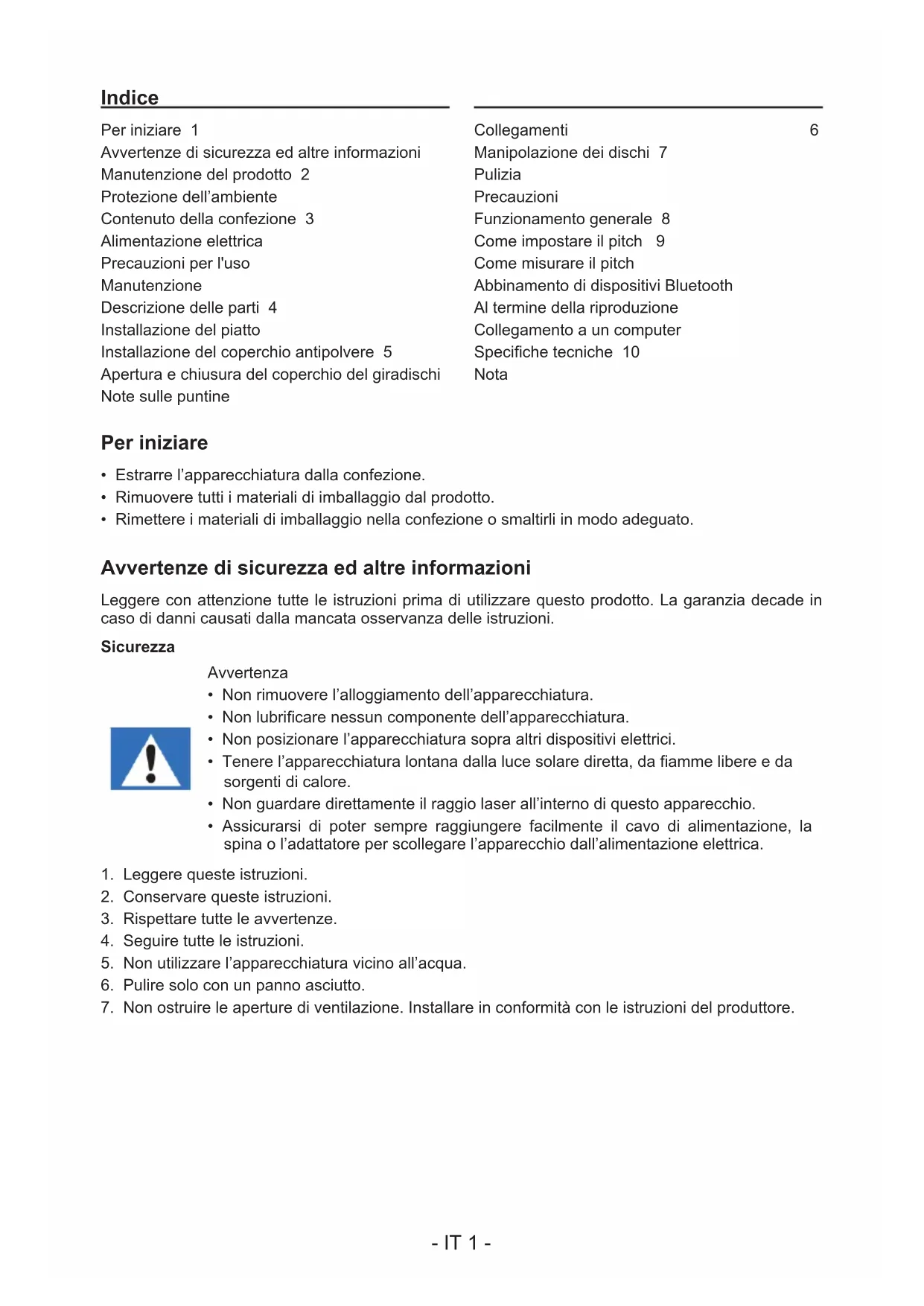 PRIMA DI UTILIZZARE L’APPARECCHIO, LEGGERE PER INTERO IL PRESENTE MANUALE E CONSERVARLO PER CONSULTAZIONI FUTURE. IT- IT 1 - Indice Per iniziare 1 Avvertenze di sicurezza ed altre informazioni Manutenzione del prodotto 2 Protezione dell’ambiente Contenuto della confezione 3 Alimentazione elettrica Precauzioni per l'uso Manutenzione Descrizione delle parti 4 Installazione del piatto Installazione del coperchio antipolvere 5 Apertura e chiusura del coperchio del giradischi Note sulle puntine Collegamenti 6 Manipolazione dei dischi 7 Pulizia Precauzioni Funzionamento generale 8 Come impostare il pitch 9 Come misurare il pitch Abbinamento di dispositivi Bluetooth Al termine della riproduzione Collegamento a un computer Speciche tecniche 10 Nota Per iniziare