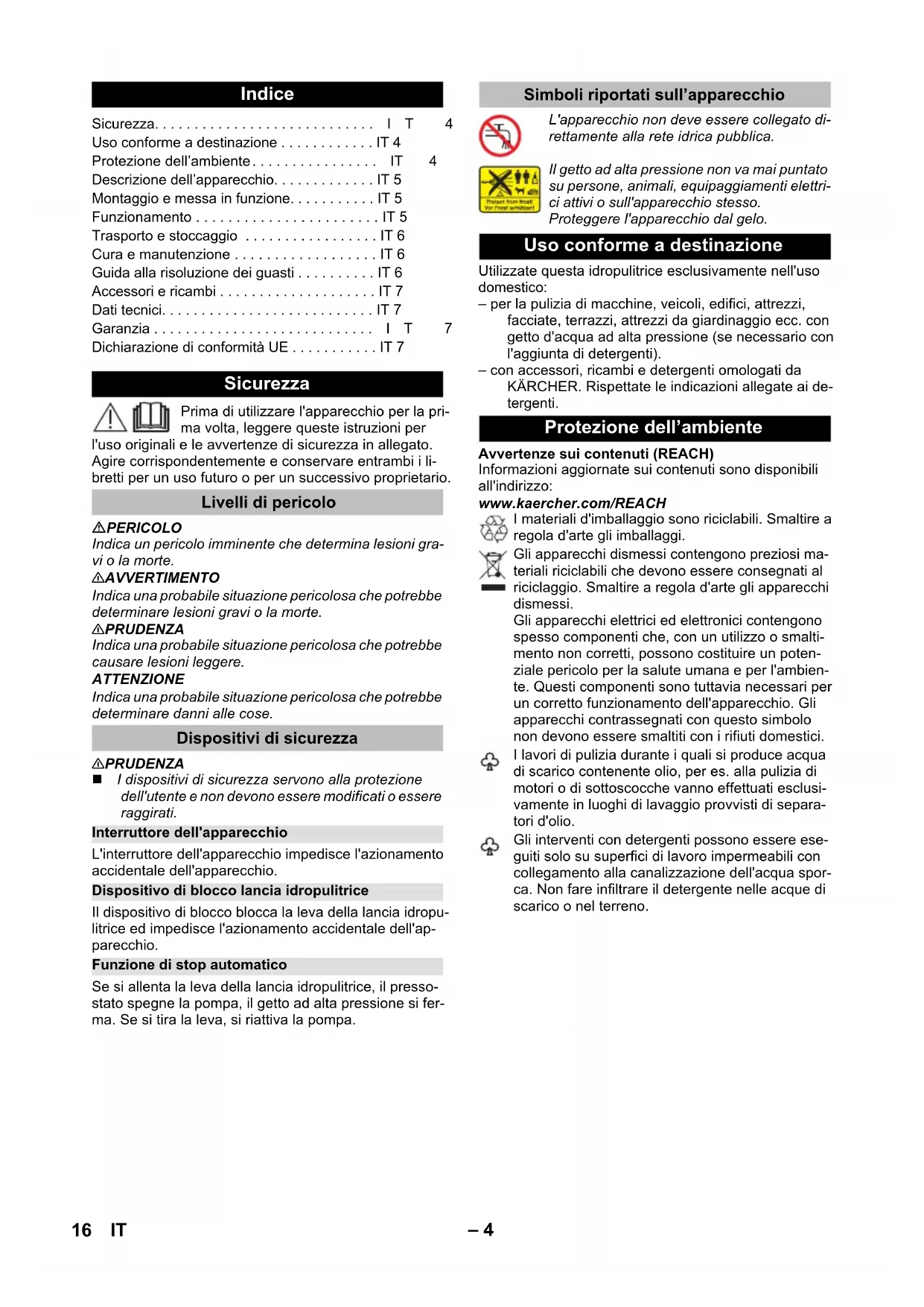 90 dB(A) Sous réserve de modifications techniques. Garantie Déclaration UE de conformité Produit: Nettoyeur haute pression Type: 1.673-xxx Directives européennes en vigueur : 2000/14/CE 2014/30/UE 2006/42/CE (+2009/127/CE) 2011/65/UE Normes harmonisées appliquées : EN 50581 EN 55014–1: 2006+A1: 2009+A2: 2011 EN 55014–2: 2015 EN 60335–1 EN 60335–2–79 EN 61000–3–2: 2014 EN 61000–3–3: 2013 EN 62233: 2008 Procédures d'évaluation de la conformité 2000/14/CE: Annexe V Niveau de puissance acoustique dB(A) Mesuré: 88 Garanti: 90 Winnenden, 2016/08/01 CEO Head of Approbation 15FR– 4 Prima di utilizzare l'apparecchio per la pri- ma volta, leggere queste istruzioni per l'uso originali e le avvertenze di sicurezza in allegato. Agire corrispondentemente e conservare entrambi i li- bretti per un uso futuro o per un successivo proprietario. PERICOLO Indica un pericolo imminente che determina lesioni gra- vi o la morte. 몇 AVVERTIMENTO Indica una probabile situazione pericolosa che potrebbe determinare lesioni gravi o la morte. 몇 PRUDENZA Indica una probabile situazione pericolosa che potrebbe causare lesioni leggere. ATTENZIONE Indica una probabile situazione pericolosa che potrebbe determinare danni alle cose. 몇 PRUDENZA I dispositivi di sicurezza servono alla protezione dell'utente e non devono essere modificati o essere raggirati. L'interruttore dell'apparecchio impedisce l'azionamento accidentale dell'apparecchio. Il dispositivo di blocco blocca la leva della lancia idropu- litrice ed impedisce l'azionamento accidentale dell'ap- parecchio. Se si allenta la leva della lancia idropulitrice, il presso- stato spegne la pompa, il getto ad alta pressione si fer- ma. Se si tira la leva, si riattiva la pompa. Utilizzate questa idropulitrice esclusivamente nell'uso domestico: – per la pulizia di macchine, veicoli, edifici, attrezzi, facciate, terrazzi, attrezzi da giardinaggio ecc. con getto d'acqua ad alta pressione (se necessario con l'aggiunta di detergenti). – con accessori, ricambi e detergenti omologati da KÄRCHER. Rispettate le indicazioni allegate ai de- tergenti. Avvertenze sui contenuti (REACH) Informazioni aggiornate sui contenuti sono disponibili all'indirizzo: www.kaercher.com/REACH Indice Sicurezza...IT 4 Uso conforme a destinazione ... IT 4 Protezione dell’ambiente... IT 4 Descrizione dell’apparecchio... IT 5 Montaggio e messa in funzione... IT 5 Funzionamento ... IT 5 Trasporto e stoccaggio ... IT 6 Cura e manutenzione ... IT 6 Guida alla risoluzione dei guasti ... IT 6 Accessori e ricambi ... IT 7 Dati tecnici... IT 7 Garanzia ...IT 7 Dichiarazione di conformità UE ... IT 7 Sicurezza Livelli di pericolo Dispositivi di sicurezza Interruttore dell'apparecchio Dispositivo di blocco lancia idropulitrice Funzione di stop automatico Simboli riportati sull’apparecchio L'apparecchio non deve essere collegato di- rettamente alla rete idrica pubblica. Il getto ad alta pressione non va mai puntato su persone, animali, equipaggiamenti elettri- ci attivi o sull'apparecchio stesso. Proteggere l'apparecchio dal gelo. Uso conforme a destinazione Protezione dell’ambiente I materiali d'imballaggio sono riciclabili. Smaltire a regola d'arte gli imballaggi. Gli apparecchi dismessi contengono preziosi ma- teriali riciclabili che devono essere consegnati al riciclaggio. Smaltire a regola d'arte gli apparecchi dismessi. Gli apparecchi elettrici ed elettronici contengono spesso componenti che, con un utilizzo o smalti- mento non corretti, possono costituire un poten- ziale pericolo per la salute umana e per l'ambien- te. Questi componenti sono tuttavia necessari per un corretto funzionamento dell'apparecchio. Gli apparecchi contrassegnati con questo simbolo non devono essere smaltiti con i rifiuti domestici. I lavori di pulizia durante i quali si produce acqua di scarico contenente olio, per es. alla pulizia di motori o di sottoscocche vanno effettuati esclusi- vamente in luoghi di lavaggio provvisti di separa- tori d'olio. Gli interventi con detergenti possono essere ese- guiti solo su superfici di lavoro impermeabili con collegamento alla canalizzazione dell'acqua spor- ca. Non fare infiltrare il detergente nelle acque di scarico o nel terreno. 16 IT– 5 L'equipaggiamento dell'apparecchio (in funzione del modello) è riportato sulla confezione. Le presenti istru- zioni per l'uso descrivono tutte le opzioni possibili. Per le figure vedi pagine con grafico 1 Attacco alta pressione 2 Interruttore dell'apparecchio „0/OFF“ / „I/ON“ 3 Gancio di conservazione 4 Maniglia di trasporto 5 Maniglia per trasporto, estraibile 6 Custodia per lancia 7 Custodia per lancia dell'idropulitrice 8 Collegamento dell'acqua con filtro montato 9 Giunto per collegamento dell'acqua 10 Cavo di allacciamento alla rete con connettore 11 Ruota trasporto 12 Lancia dell'idropulitrice 13 Dispositivo di blocco lancia idropulitrice 14 Morsetto per tubo flessibile di alta pressione 15 Tubo flessibile alta pressione 16 Full Control lancia fresa per sporco Per lo sporco più resistente Livello di pressione: HARD 17 Lancia Full Control Click-Vario Power Per operazioni di pulizia più comuni. Livelli di pressione: HARD / MEDIUM / SOFT / MIX Per le figure vedi pagine con grafico Illustrazioni - Prima della messa in funzione montare i compo- nenti singoli dell'apparecchio. Posizionare l'apparecchio su una superficie piana. Figure - Estrarre il morsetto dalla lancia dell'idropulitrice ed inserire il tubo flessibile per alta pressione nella lancia. Introdurre il morsetto fino al suo aggancio. Accer- tarsi del corretto aggancio tirando il tubo flessibile di alta pressione. Figure - ATTENZIONE Impurità nell'acqua possono danneggiare la pompa ad alta pressione e gli accessori. Consigliamo come prote- zione di utilizzare il filtro per l'acqua KÄRCHER (acces- sorio speciale, codice d'ordine 4.730-059). 몇 PRUDENZA Un funzionamento a secco di oltre 2 minuti determina dei danneggiamenti sulla pompa ad al
