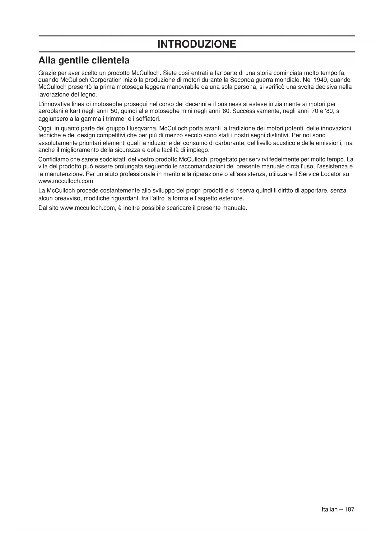 AVVERTENZA! Usati in maniera impropria o negligente il decespugliatore forestale, il decespugliatore e il bordatore possono essere attrezzi pericolosi, in grado di provocare lesioni gravi o mortali all’utilizzatore o a terzi. È estremamente importante leggere e comprendere il contenuto del manuale dell’operatore.Italian – 187 INTRODUZIONE Alla gentile clientela Grazie per aver scelto un prodotto McCulloch. Siete così entrati a far parte di una storia cominciata molto tempo fa, quando McCulloch Corporation iniziò la produzione di motori durante la Seconda guerra mondiale. Nel 1949, quando McCulloch presentò la prima motosega leggera manovrabile da una sola persona, si verificò una svolta decisiva nella lavorazione del legno. L'innovativa linea di motoseghe proseguì nel corso dei decenni e il business si estese inizialmente ai motori per aeroplani e kart negli anni '50, quindi alle motoseghe mini negli anni '60. Successivamente, negli anni '70 e '80, si aggiunsero alla gamma i trimmer e i soffiatori. Oggi, in quanto parte del gruppo Husqvarna, McCulloch porta avanti la tradizione dei motori potenti, delle innovazioni tecniche e dei design competitivi che per più di mezzo secolo sono stati i nostri segni distintivi. Per noi sono assolutamente prioritari elementi quali la riduzione del consumo di carburante, del livello acustico e delle emissioni, ma anche il miglioramento della sicurezza e della facilità di impiego. Confidiamo che sarete soddisfatti del vostro prodotto McCulloch, progettato per servirvi fedelmente per molto tempo. La vita del prodotto può essere prolungata seguendo le raccomandazioni del presente manuale circa l’uso, l’assistenza e la manutenzione. Per un aiuto professionale in merito alla riparazione o all’assistenza, utilizzare il Service Locator su www.mcculloch.com. La McCulloch procede costantemente allo sviluppo dei propri prodotti e si riserva quindi il diritto di apportare, senza alcun preavviso, modifiche riguardanti fra l’altro la forma e l’aspetto esteriore. Dal sito www.mcculloch.com, è inoltre possibile scaricare il presente manuale.188 – Italian CHE COSA C’È? Cosa è presente sul tagliabordi e sul decespugliatore?