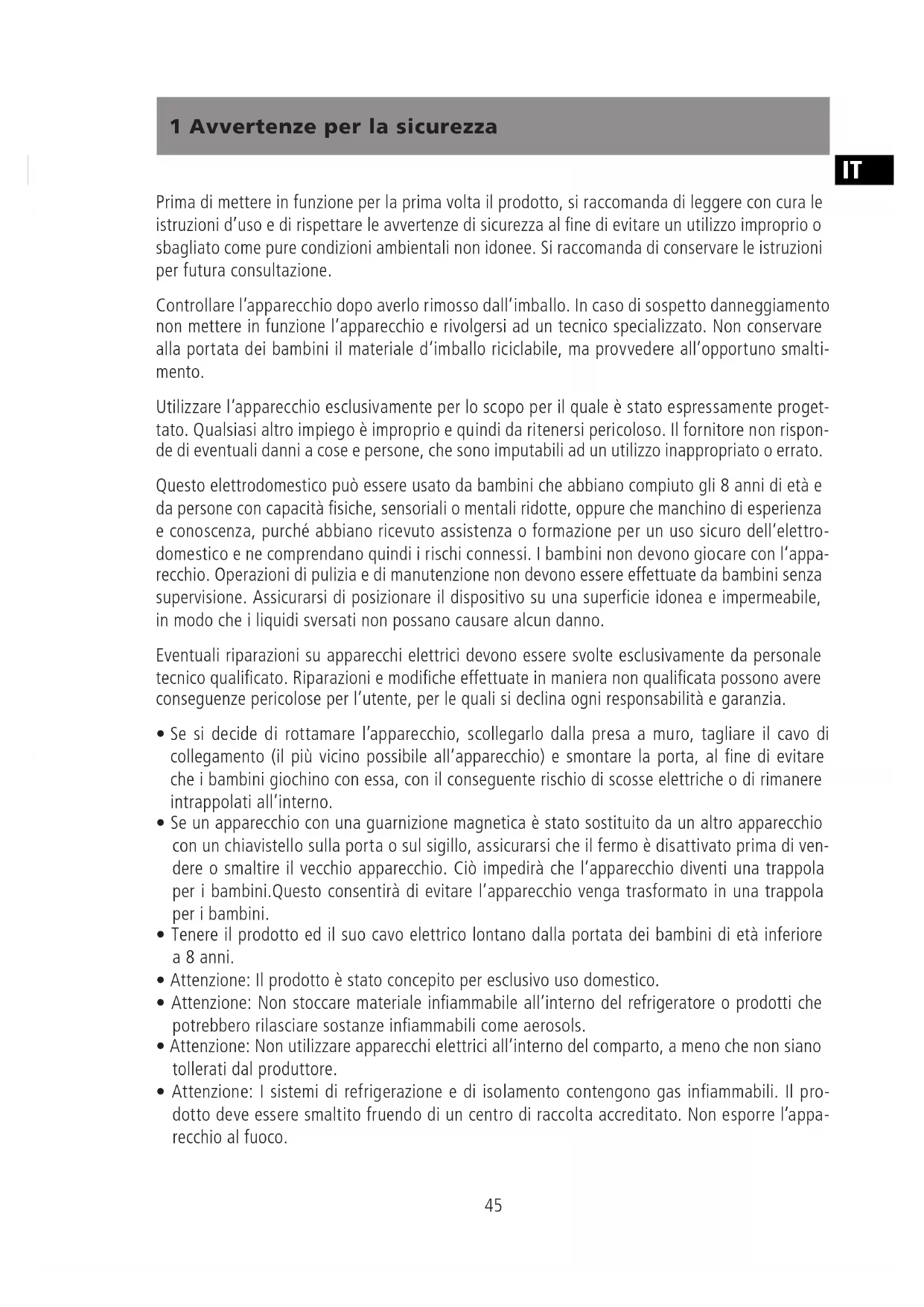 INDICE 1 Avvertenze per la sicurezza 45 2 Caratteristiche del vostro frigorif ero per vini 46 3 Fluido refritgerante 47 4 Sicurezza elettrica 48 5 Utilizzo giornaliero 48 6 Pulizia e manutenzione 49 7 Importanti informazioni riguardo l’installazione 49 8 Risparmio energetico 49 9 Risoluzione dei problemi 50 10 Instruzioni di installazione50 11 Funzionamento del vostro frigorifero per vini 54 12 Descrizione delle spie 56 13 Uscite di controllo 57 14 Temperatura per vini consigliata 59 15 Manutenzione 59 16 Cosa fare in caso di interruzione di corrente 59 17 Stoccaggio del frigorifero per vini 60 18 Se si ha necessità di muovere il frigo 60 19 Consigli per risparmiare energia 60 20 In caso di guasto 60 21 Garanzia / Smaltimento / Modifiche tecniche 6245 1 Avvertenze per la sicurezza