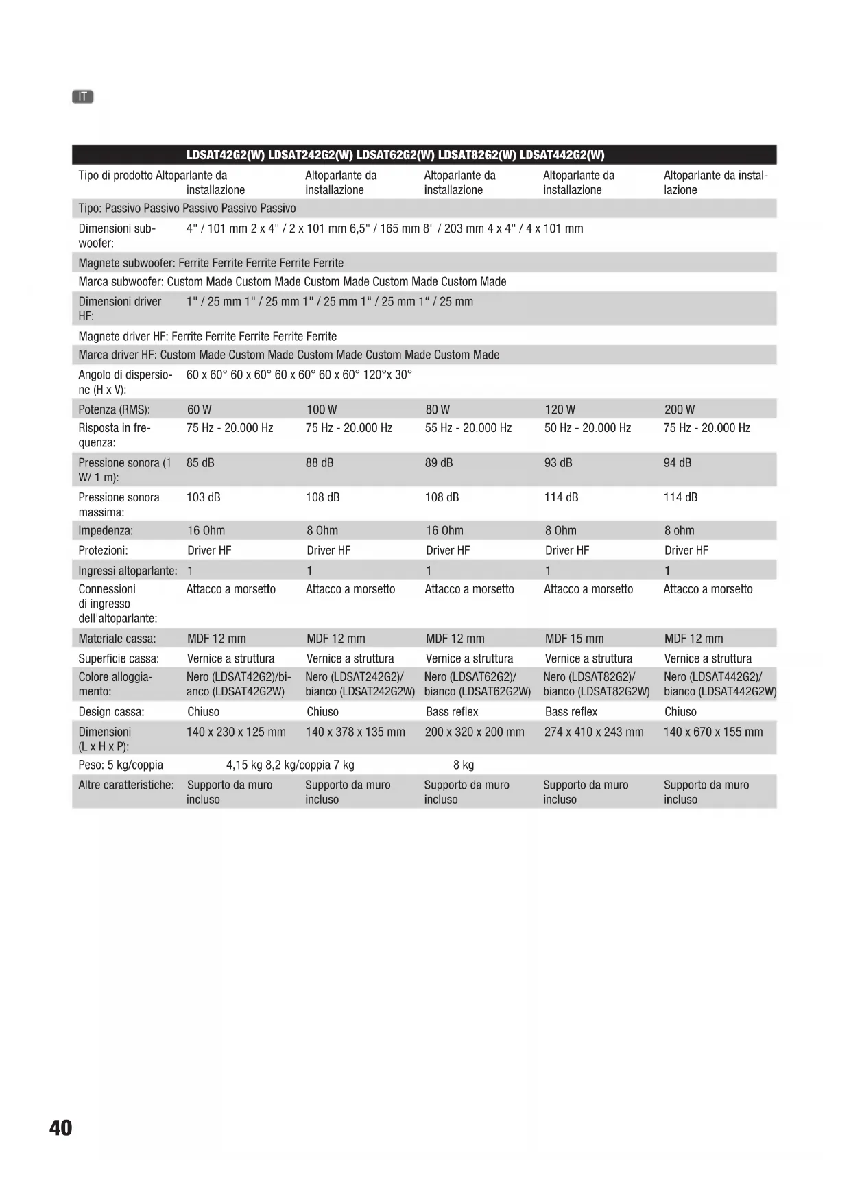 LDSAT42G2(W) LDSAT242G2(W) LDSAT62G2(W) LDSAT82G2(W) LDSAT442G2(W) Tipo di prodotto Altoparlante da installazione Altoparlante da installazione Altoparlante da installazione Altoparlante da installazione Altoparlante da instal- lazione Tipo: Passivo Passivo Passivo Passivo Passivo Dimensioni sub- woofer: 4" / 101 mm 2 x 4" / 2 x 101 mm 6,5" / 165 mm 8" / 203 mm 4 x 4" / 4 x 101 mm Magnete subwoofer: Ferrite Ferrite Ferrite Ferrite Ferrite Marca subwoofer: Custom Made Custom Made Custom Made Custom Made Custom Made Dimensioni driver HF: 1" / 25 mm 1" / 25 mm 1" / 25 mm 1“ / 25 mm 1“ / 25 mm Magnete driver HF: Ferrite Ferrite Ferrite Ferrite Ferrite Marca driver HF: Custom Made Custom Made Custom Made Custom Made Custom Made Angolo di dispersio- ne (H x V): 60 x 60° 60 x 60° 60 x 60° 60 x 60° 120°x 30° Potenza (RMS): 60 W 100 W 80 W 120 W 200 W Risposta in fre- quenza: 75 Hz - 20.000 Hz 75 Hz - 20.000 Hz 55 Hz - 20.000 Hz 50 Hz - 20.000 Hz 75 Hz - 20.000 Hz Pressione sonora (1 W/ 1 m): 85 dB 88 dB 89 dB 93 dB 94 dB Pressione sonora massima: 103 dB 108 dB 108 dB 114 dB 114 dB Impedenza: 16 Ohm 8 Ohm 16 Ohm 8 Ohm 8 ohm Protezioni: Driver HF Driver HF Driver HF Driver HF Driver HF Ingressi altoparlante: 1 1 1 1 1 Connessioni di ingresso dell'altoparlante: Attacco a morsetto Attacco a morsetto Attacco a morsetto Attacco a morsetto Attacco a morsetto Materiale cassa: MDF 12 mm MDF 12 mm MDF 12 mm MDF 15 mm MDF 12 mm Superficie cassa: Vernice a struttura Vernice a struttura Vernice a struttura Vernice a struttura Vernice a struttura Colore alloggia- mento: Nero (LDSAT42G2)/bi- anco (LDSAT42G2W) Nero (LDSAT242G2)/ bianco (LDSAT242G2W) Nero (LDSAT62G2)/ bianco (LDSAT62G2W) Nero (LDSAT82G2)/ bianco (LDSAT82G2W) Nero (LDSAT442G2)/ bianco (LDSAT442G2W) Design cassa: Chiuso Chiuso Bass reflex Bass reflex Chiuso Dimensioni (L x H x P): 140 x 230 x 125 mm 140 x 378 x 135 mm 200 x 320 x 200 mm 274 x 410 x 243 mm 140 x 670 x 155 mm Peso: 5 kg/coppia 4,15 kg 8,2 kg/coppia 7 kg 8 kg Altre caratteristiche: Supporto da muro incluso Supporto da muro incluso Supporto da muro incluso Supporto da muro incluso Supporto da muro incluso41 LDSUB88 Tipo di prodotto: Subwoofer da instal- lazione Tipo: Passivo Dimensioni subwoofer: 2 x 8" / 2 x 203 mm Magnete subwoofer: Ferrite Marca subwoofer: Custom Made Potenza (RMS): 200 (2x100)W Risposta in frequenza: 40 Hz - 120 Hz Pressione sonora (1 W/ 1 m): 92 dB SPL massimo: 115 dB Impedenza: 2 x 8 Ohm Ingressi altoparlante: 2 Connessioni di ingresso dell'altoparlante: Attacco a morsetto Uscite altoparlante: 2 Connessioni di uscita dell'altoparlante: Attacco a morsetto Materiale cassa: MDF 15 mm Superficie cassa: Vernice a struttura Colore alloggiamento: Nero Design cassa: Bandpass Dimensioni (L x H x P): 600 x 250 x 350 mm Peso: 13,3 kg Altre caratteristiche: Low-pass interno (120 Hz) LDSAT62AG2(W) LDSAT82AG2(W) Tipo di prodotto: Altoparlante da instal- lazione Altoparlante da instal- lazione Tipo: Attivo Attivo Dimensioni subwoofer: 6,5" / 165 mm 8" / 203.2 mm Magnete subwoofer: Ferrite Ferrite Marca subwoofer: Custom Made Custom Made Dimensioni driver HF: 1" / 25 mm 1" / 25 mm Magnete driver HF: Ferrite Ferrite Marca driver HF: Custom Made Custom Made Amplificatore: Classe AB Classe AB Angolo di dispersione (H x V): 60 x 60° 60 x 60° Potenza (RMS): 50 W 80 W Risposta in frequenza: 55 Hz - 20.000 Hz 50 Hz - 20.000 Hz Pressione sonora massima: 108 dB 114 dB Protezioni: Driver HF, sovracorrente Sovracorrente, driver HF Dispositivi di comando: Interruttore di accensi- one (On/Off), regolatore di volume, modalità commutabile AUTO/ON Regolatore di volume, interruttore di accensio- ne (On/Off), Power Mode (On/Auto) Indicatori: Power Power, Limit Connessioni di ingresso di linea: XLR/jack da 6,3 mm (combo) Jack da 6,3 mm, XLR Collegamenti uscita di linea: XLR XLR Alimentazione: Trasformatore Trasformatore Tensione di esercizio: 220 V AC - 240 V AC,