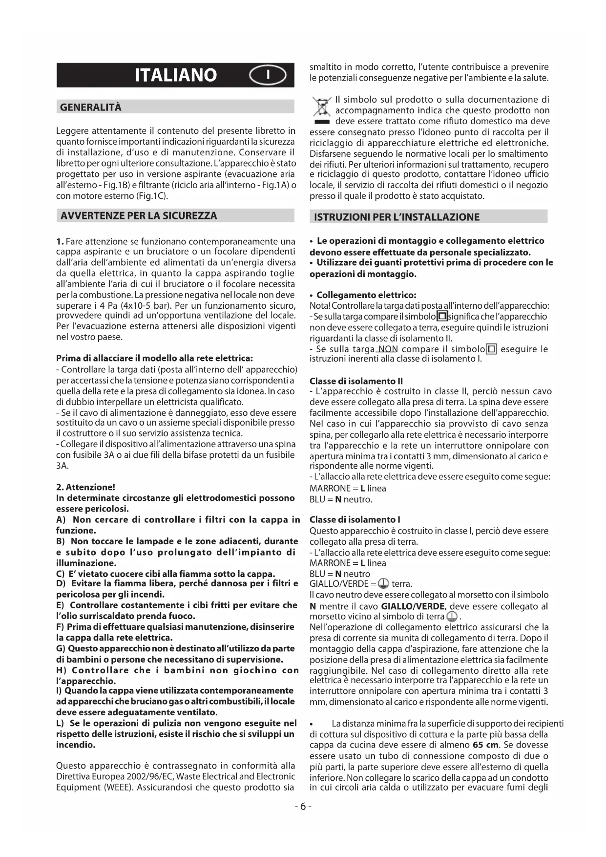 ad apparecchi che bruciano gas o altri combustibili, il locale deve essere adeguatamente ventilato. L) Se le operazioni di pulizia non vengono eseguite nel rispetto delle istruzioni, esiste il rischio che si sviluppi un incendio. Questo apparecchio è contrassegnato in conformità alla Direttiva Europea 2002/96/EC, Waste Electrical and Electronic Equipment (WEEE). Assicurandosi che questo prodotto sia smaltito in modo corretto, l’utente contribuisce a prevenire le potenziali conseguenze negative per l’ambiente e la salute. Il simbolo sul prodotto o sulla documentazione di accompagnamento indica che questo prodotto non deve essere trattato come rifiuto domestico ma deve essere consegnato presso l’idoneo punto di raccolta per il riciclaggio di apparecchiature elettriche ed elettroniche. Disfarsene seguendo le normative locali per lo smaltimento dei rifiuti. Per ulteriori informazioni sul trattamento, recupero e riciclaggio di questo prodotto, contattare l’idoneo ufficio locale, il servizio di raccolta dei rifiuti domestici o il negozio presso il quale il prodotto è stato acquistato.