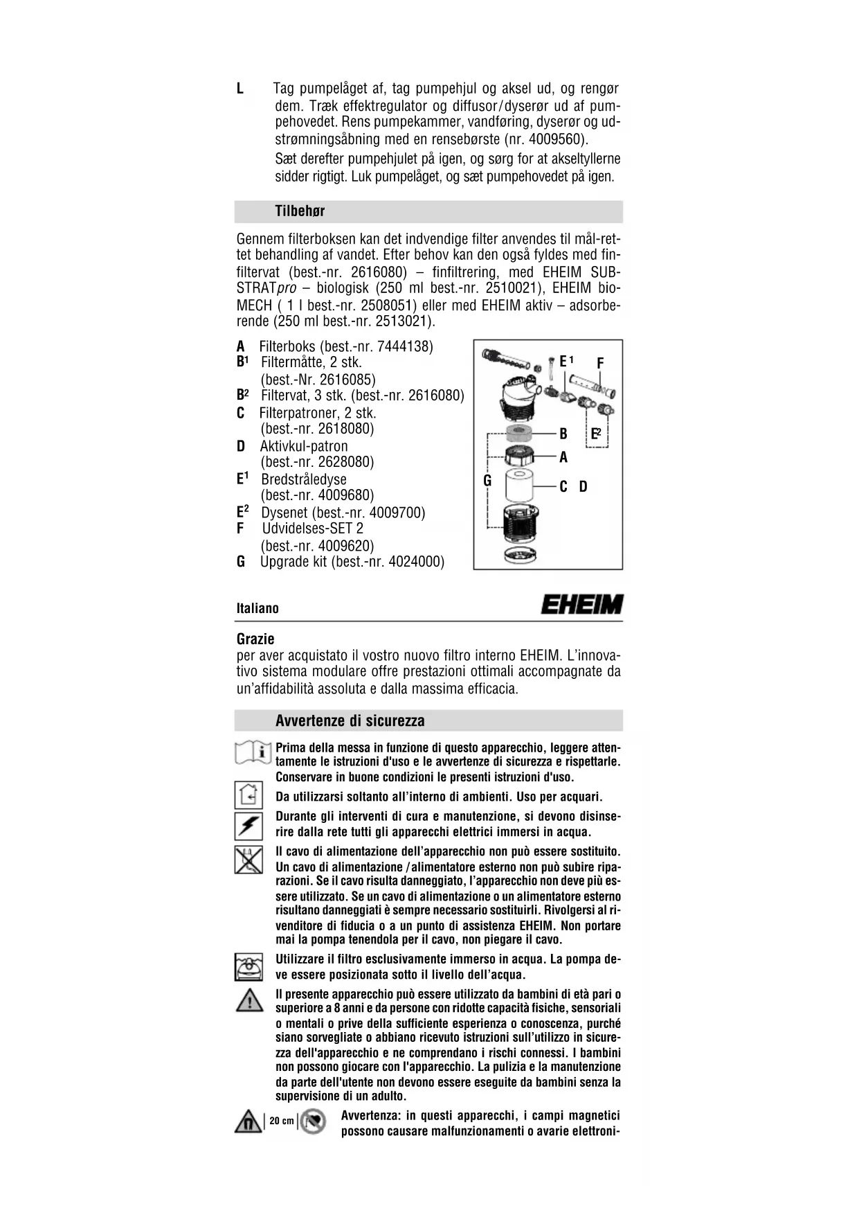 Il prodotto è omologato secondo le vigenti disposizioni e direttive nazionali ed à conforme alle norme EU.Manutenzione K Scollegare il filtro dalla rete! Per rimuovere la testa della pompa, togliere la pompa dal supporto della testa della pompa. L Smontare il coperchio della pompa, estrarre la girante e l’as- se ed eseguire la pulizia. Estrarre il regolatore di potenza e il diffusore/tubo con ugelli dalla testa della pompa. Pulire la camera della pompa, l’alimentazione dell’acqua, tubo con ugelli e l’apertura de efflusso con una spazzola apposita (nº ord. 4009560). Al termine, rimontare la girante della pompa, facendo at- tenzione alla giusta collocazione delle bocchette dell’asse. Chiudere il coperchio della pompa e rimontare la testa della pompa. E Ruotando il regolatore di potenza è possibile regolare gra- dualmente la potenza della pompa, secondo necessità. La valvola di regolazione dell’aria del diffusore consente di dosare l’ossigenazione dell’acqua. Attenzione: la potenza del diffusore diminuisce all’aumentare del grado di impurità. Pulizia F Scollegare il filtro dalla rete, dopodiché estrarre dal sup- porto, verso l’alto. G Esercitando una leggera pressione sulla rispettiva clip, è possibile separare tra loro con facilità i singoli contenitori per filtri. H Al termine, pulire i moduli e lavare la/le cartuccia/e del filtro. Nei modelli 130 e 180 si dovrebbe lavare una delle cartucce soltanto semplicemente sotto acqua tiepida, per preservare la patina batterica ed accelerarne il nuovo sviluppo. I Togliere dal supporto della testa della pompa la scatola del filtro che si trova sul bordo dove si era prevista l’applicazio- ne. Aprire il coperchio e lavare o sostituire il feltro filtrante. Al termine, rimontare le parti del filtro pulite, prestando at- tenzione alla forma prestabilita. Accessori Nella scatola del filtro si può inserire il filtro interno per un tratta- mento mirato dell’acqua. A scelta, è possibile inserire anche il mate- riale filtrante fine (nº 2616080) – per il filtraggio fine: EHEIM SUB- STRATpro – biologico (250 ml, nº 2510021), EHEIM bioMECH (1 l, nº 2508051), oppure EHEIM aktiv – adsorbente (250 ml, nº 2513021). A Scatola del filtro (nº. 7444138)