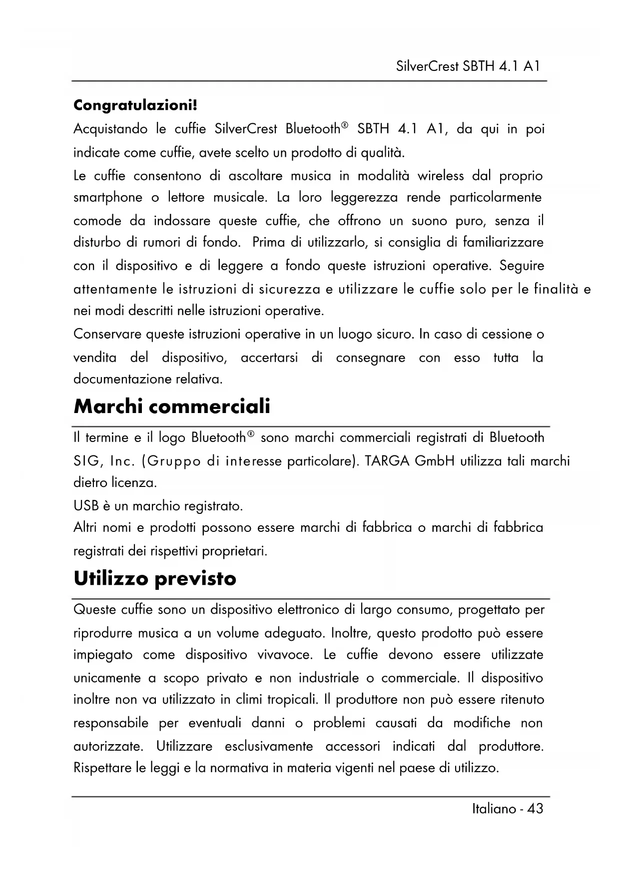 sono marchi commerciali registrati di Bluetooth SIG, Inc. (Gruppo di interesse particolare). TARGA GmbH utilizza tali marchi dietro licenza. USB è un marchio registrato. Altri nomi e prodotti possono essere marchi di fabbrica o marchi di fabbrica registrati dei rispettivi proprietari. Utilizzo previsto Queste cuffie sono un dispositivo elettronico di largo consumo, progettato per riprodurre musica a un volume adeguato. Inoltre, questo prodotto può essere impiegato come dispositivo vivavoce. Le cuffie devono essere utilizzate unicamente a scopo privato e non industriale o commerciale. Il dispositivo inoltre non va utilizzato in climi tropicali. Il produttore non può essere ritenuto responsabile per eventuali danni o problemi causati da modifiche non autorizzate. Utilizzare esclusivamente accessori indicati dal produttore. Rispettare le leggi e la normativa in materia vigenti nel paese di utilizzo.SilverCrest SBTH 4.1 A1