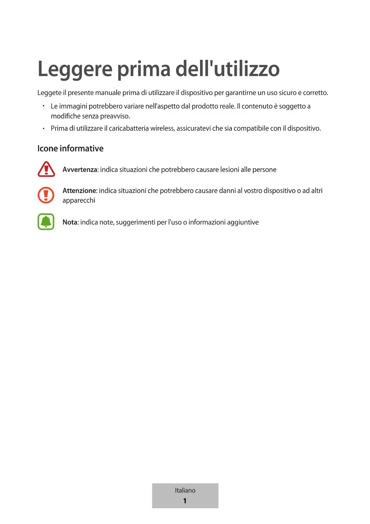 Prima di utilizzare il caricabatteria wireless, assicuratevi che sia compatibile con il dispositivo. Icone informative Avvertenza: indica situazioni che potrebbero causare lesioni alle persone Attenzione: indica situazioni che potrebbero causare danni al vostro dispositivo o ad altri apparecchi Nota: indica note, suggerimenti per l'uso o informazioni aggiuntive Italiano