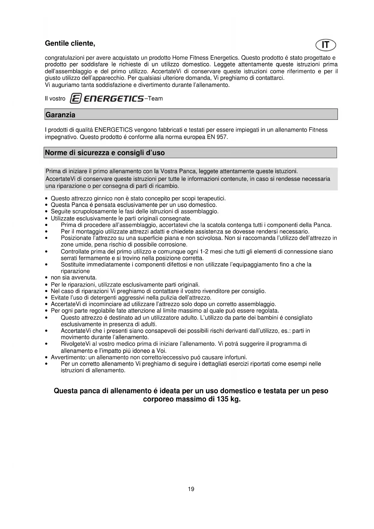 Gentile cliente, congratulazioni per avere acquistato un prodotto Home Fitness Energetics. Questo prodotto é stato progettato e prodotto per soddisfare le richieste di un utilizzo domestico. Leggete attentamente queste istruzioni prima dell’assemblaggio e del primo utilizzo. AccertateVi di conservare queste istruzioni come riferimento e per il giusto utilizzo dell’apparecchio. Per qualsiasi ulteriore domanda, Vi preghiamo di contattarci. Vi auguriamo tanta soddisfazione e divertimento durante l’allenamento. Il vostro –Team Garanzia