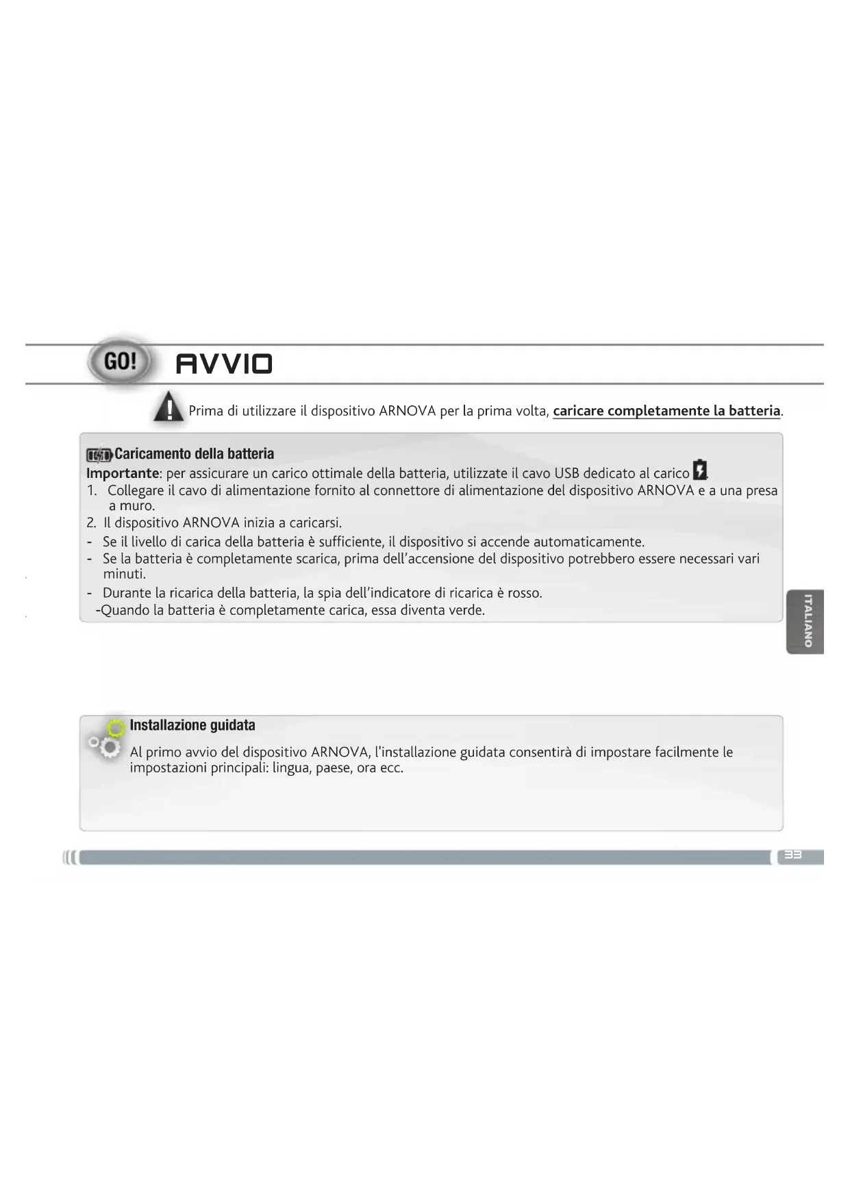 ITALIANO AVVIO Installazione guidata Al primo avvio del dispositivo ARNOVA, l'installazione guidata consentirà di impostare facilmente le impostazioni principali: lingua, paese, ora ecc. Prima di utilizzare il dispositivo ARNOVA per la prima volta, caricare completamente la batteria. Importante: per assicurare un carico ottimale della batteria, utilizzate il cavo USB dedicato al carico .