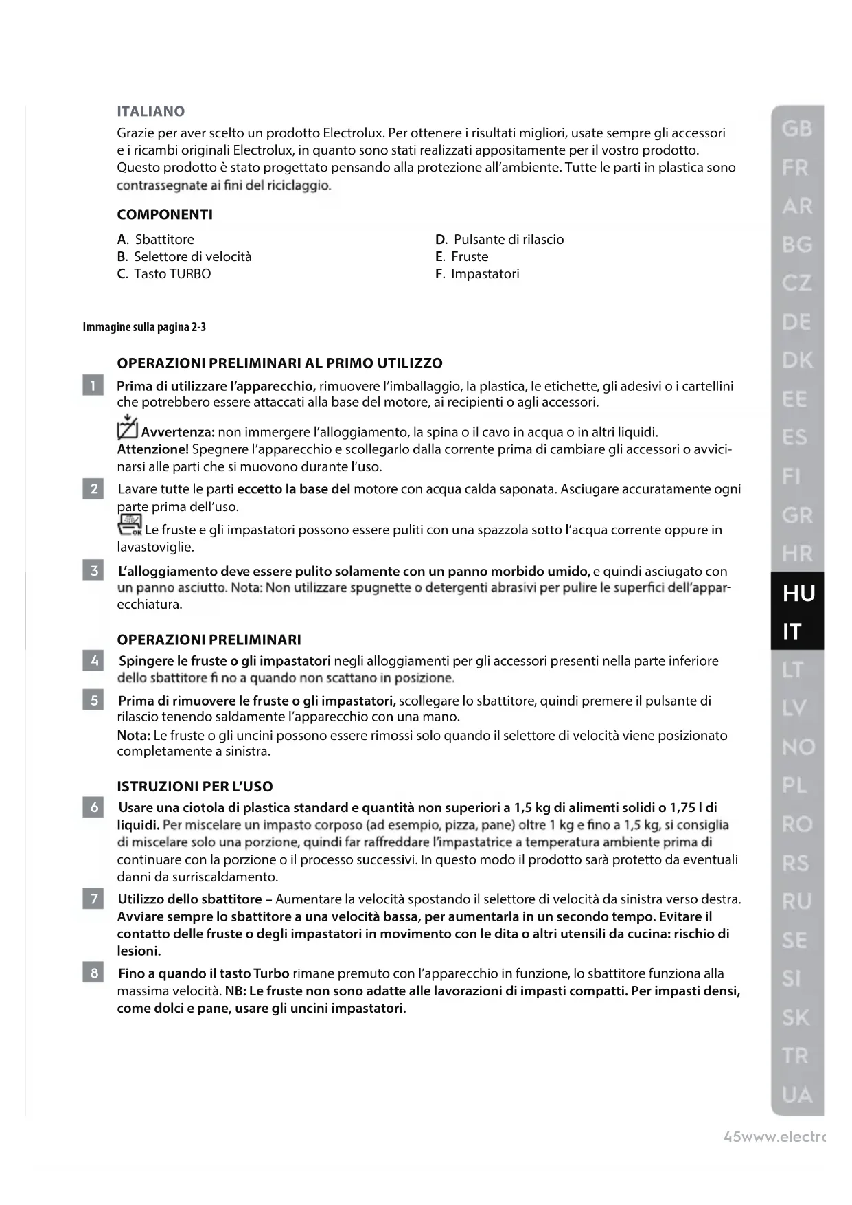 ITALIANO Grazie per aver scelto un prodotto Electrolux. Per ottenere i risultati migliori, usate sempre gli accessori e i ricambi originali Electrolux, in quanto sono stati realizzati appositamente per il vostro prodotto. Questo prodotto è stato progettato pensando alla protezione all’ambiente. Tutte le parti in plastica sono COMPONENTI A. Sbattitore B. Selettore di velocità C. Tasto TURBO D. Pulsante di rilascio E. Fruste F. Impastatori Immagine sulla pagina 2-3