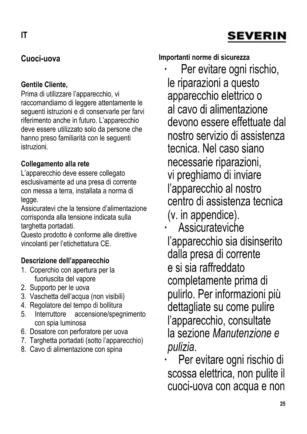 Importanti norme di sicurezza ∙ Per evitare ogni rischio, le riparazioni a questo apparecchio elettrico o al cavo di alimentazione devono essere effettuate dal nostro servizio di assistenza tecnica. Nel caso siano necessarie riparazioni, vi preghiamo di inviare l’apparecchio al nostro centro di assistenza tecnica (v. in appendice). ∙ Assicuratevi che l’apparecchio sia disinserito dalla presa di corrente e si sia raffreddato completamente prima di pulirlo. Per informazioni più dettagliate su come pulire l’apparecchio, consultate la sezione Manutenzione e pulizia. ∙ Per evitare ogni rischio di scossa elettrica, non pulite il cuoci-uova con acqua e non IT26 immergetelo in acqua. ∙ Questo apparecchio è studiato per il solo uso domestico o per impieghi simili, come per esempio - cucine per il personale, negozi, uffi ci e altri ambienti simili di lavoro, - aziende agricole, - clienti di alberghi, motel e sistemazioni simili, - clienti di pensioni “bed- and-breakfast” (letto & colazione). ∙ Maneggiate con attenzione il perforatore di uova, c’è il pericolo di ferirsi. ∙ Le superfi ci esterne della vaschetta per l’acqua diventano calde durante il funzionamento e restano calde ancora per un certo tempo dopo. Quando l’apparecchio è caldo, toccatene solo i manici. ∙ Avvertenza: Dal coperchio potrebbe fuoriuscire vapore bollente. ∙ Avvertenza: Il cattivo uso può essere causa di gravi lesioni alla persona. ∙ Il presente apparecchio può essere usato da bambini (di almeno 8 anni di età) e da persone con ridotte capacità fi siche, sensoriali o mentali, o da persone senza particolari esperienze o conoscenze, purché siano sotto sorveglianza o siano state date loro istruzioni sull’uso dell’apparecchio e comprendano pienamente i rischi e le precauzioni di sicurezza che l’apparecchio comporta. ∙ Ai bambini non deve essere consentito di giocare con l’apparecchio. ∙ Ai bambini non deve essere consentito di effettuare operazioni di27 pulizia o di manutenzione sull’apparecchio a meno che non siano supervisionati da un adulto e siano comunque più grandi di 8 anni di età. ∙ L’apparecchio e il cavo di alimentazione devono essere tenuti sempre fuori della portata di bambini di età inferiore agli 8 anni. ∙ Avvertenza: Tutto il materiale di imballaggio deve essere tenuto fuori della portata dei bambini a causa del rischio potenziale esistente, per esempio di soffocamento. ∙ Prima di ogni utilizzo dell’apparecchio, controllate attentamente che l’apparecchio e gli accessori inseriti non presentino tracce di deterioramento. Se per esempio fosse caduto battendo su una superfi cie dura, o se è stata usata una forza eccessiva nel tirare il cavo di alimentazione, l’apparecchio non va più usato: danni anche invisibili ad occhio nudo potrebbero comportare conseguenze negative sulla sicurezza nel funzionamento dell’apparecchio. In questo caso, contattate il nostro servizio di assistenza tecnica. ∙ Non lasciate l’apparecchio senza sorveglianza quando è in funzione. ∙ Evitate che il cavo di alimentazione tocchi le parti dell’apparecchio soggette a riscaldarsi, e non avvolgetelo intorno al cuoci-uova quando l’apparecchio è ancora caldo. ∙ Disinserite sempre la spina dalla presa - in caso di cattivo funzionamento, - dopo l’uso, - prima di pulire l’apparecchio. ∙ Per disinserire la spina dalla presa di corrente, non tirate mai il cavo di alimentazione ma afferrate direttamente la spina. ∙ Durante il funzionamento, l’apparecchio deve poggiare su una superfi cie piana, resistente al calore e all’acqua. ∙ Non mettete l’apparecchio sopra o vicino a superfi ci calde o fi amme libere come per esempio piastre di cottura elettriche o a gas. Non mettete in funzione l’apparecchio sotto oggetti delicati o mobili come pensili da cucina, perché fuoriesce vapore dal coperchio durante l’uso. ∙ Nessuna responsabilità verrà assunta in caso di danni risultanti da un uso errato o dalla non conformità alle istruzioni. Primo utilizzo Pulite con un panno umido la vaschetta dell’acqua, il supporto per le uova e il coperchio. Modalità d’uso ∙ Riempite completamente il dosatore con acqua fredda e versatela tutta nell’apposita vaschetta del cuoci-uova. ∙ Praticate un forellino sull’estremità arrotondata di ogni uovo aiutandovi con l’apposito perforatore; grazie a questo piccolo accorgimento, eviterete che le28 uova si spacchino durante la fase di bollitura. ∙ Sistemate le uova sull’apposito supporto, inserite il supporto sopra la vaschetta dell’acqua e chiudete il coperchio. ∙ Agite sul regolatore del tempo di bollitura per impostare il livello desiderato di durezza delle uova: – morbido – medio – duro ∙ I livelli prefi ssati si riferiscono a uova di media grandezza. È comunque possibile regolare a vostro piacimento il livello di durezza, in considerazione del numero e delle dimensioni delle uova da bollire. ∙ Inserite la spina in una presa di corrente a muro adatta e tramite l’interruttore di accensione/spegnimento mettete in funzione l’apparecchio cuoci-uova. La spia luminosa si accende. ∙ Il segnale acustico indica che il tempo di cottura preimpostato per la durezza desiderata delle uova è terminato. ∙ Spegnete l’apparecchio. La spia luminosa si spegne. Disinserite la spina dalla presa di corrente a muro. ∙ Aprite il coperchio. Avvertenza: Quando il coperchio è sollevato, dall’apparecchio fuoriesce del vapore bollente. ∙ Togliete il supporto delle uova dalla vaschetta e mettetelo immediatamente sotto il fl usso dell’acqua corrente fredda. N.B: se non togliete subito, senza esitazioni, le uova dal bollitore, il processo di rassodamento delle uova non si fermerà. Manutenzione e pulizia ∙ Prima di procedere alle operazioni di pulizia, disinserite sempre la spina dalla presa di corrente a muro, lasciate raffreddare l’apparecchio e buttate ogni residuo d’acqua. ∙ Per evitare rischi 