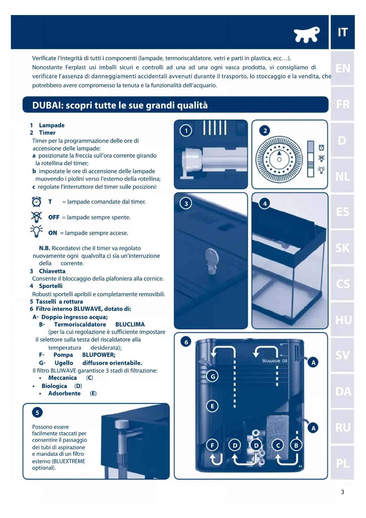 11 Attendete la maturazione del filtrto: solo dopo 10-12 giorni dall'aggiunta di BLUSTART si potranno introdurre i primi pesci. Prima di tale operazione è uncommon consigliabile controllare i valori dei principali parametri dell'accua utilizzando l'apposto misuratore MULTISTICK TESTER di Ferplast disponibile presso il vostro negotiante di fiducia. Egli potra inoltre consigliarvi sui valori ideali di temperatura, durezza, ecc, in funzione pesci e vegetali che avete deciso di allevare nel vostro acquario DUBAI. E' opportuno ripetere tale controlo con una certa Frequenza.