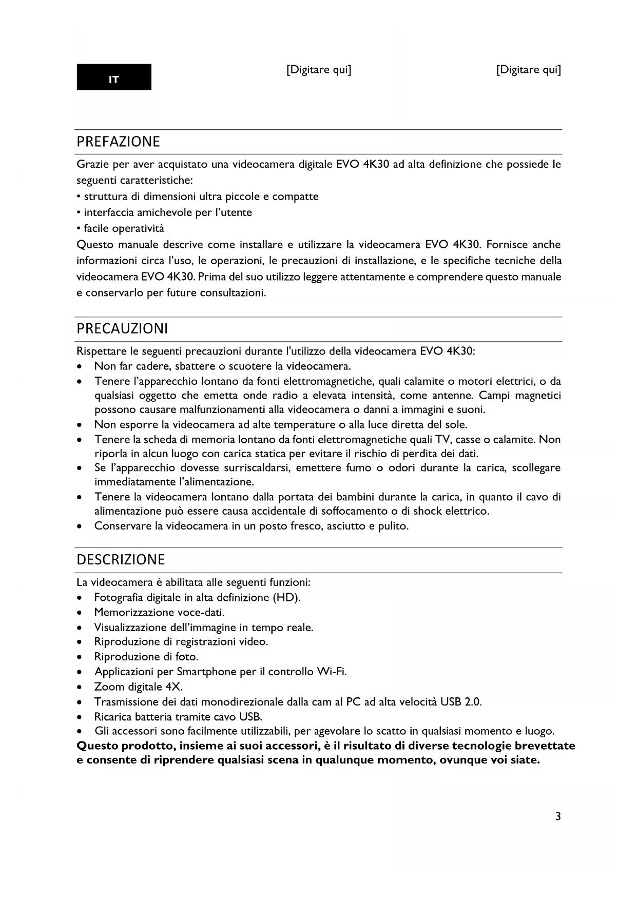 EVO 4K30 è dotata di una batteria in polimero di ionio di litio ricaricabile. Per ridurre i rischi di incendio si prega di evitare manomissioni, cadute, il contatto con acqua o fuoco. Per evitare danni personali, scariche elettriche, incendio o danni alle varie parti del prodotto, si prega di seguire quindi di non immergere il prodotto privo della custodia subacquea in acqua. SICUREZZA PERSONALE. Non aprire, riparare, manomettere o modificare la guarnizione di nessuna parte del prodotto. Evitare di toccare il prodotto con oggetti metallici o sostanze chimiche. L’inosservanza di quanto esposto sopra potrebbe comportare rischi per sé stessi e terze persone. Qualora il prodotto presenti dei malfunzionamenti, si prega di contattare il servizio tecnico o un fornitore qualificato. SUPPORTO TECNICO. Il presente prodotto è coperto da garanzia ai sensi della normativa vigente; pertanto per necessità di assistenza tecnica e/o garanzia, rivolgersi al proprio rivenditore. INFORMAZIONI AMBIENTALI.[Digitare qui] [Digitare qui] [Digitare qui]