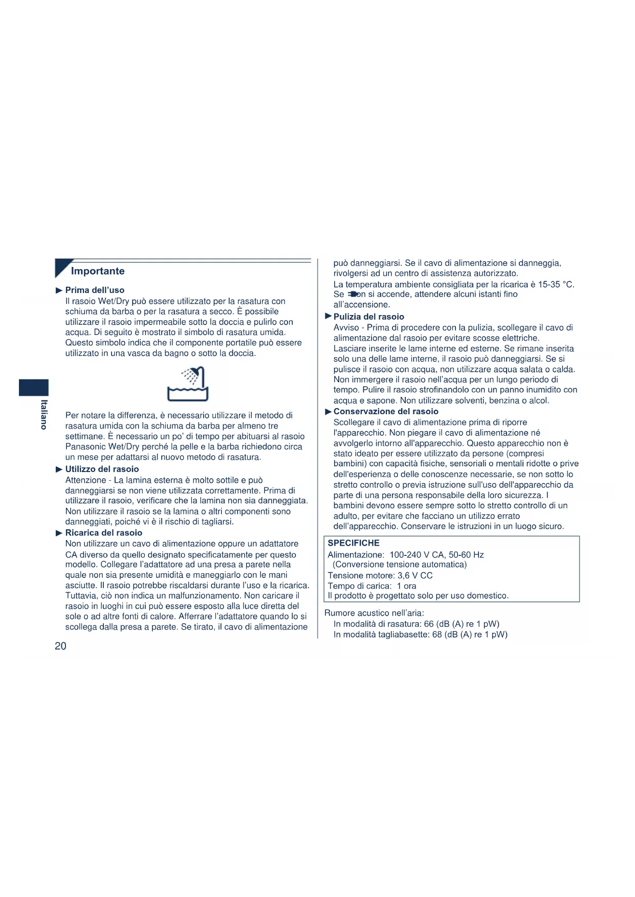 électroniques, contactez votre revendeur ou fournisseur. Informations sur l’évacuation des déchets dans les pays ne faisant pas partie de l’Union européenne Ce symbole n’est reconnu que dans l’Union européenne. Pour vous débarrasser de ce produit, veuillez contacter les autorités locales ou votre revendeur an de connaître la procédure d’élimination à suivre.20 Italiano Importante Prima dell’uso Il rasoio Wet/Dry può essere utilizzato per la rasatura con schiuma da barba o per la rasatura a secco. È possibile utilizzare il rasoio impermeabile sotto la doccia e pulirlo con acqua. Di seguito è mostrato il simbolo di rasatura umida. Questo simbolo indica che il componente portatile può essere utilizzato in una vasca da bagno o sotto la doccia. Per notare la differenza, è necessario utilizzare il metodo di rasatura umida con la schiuma da barba per almeno tre settimane. È necessario un po’ di tempo per abituarsi al rasoio Panasonic Wet/Dry perché la pelle e la barba richiedono circa un mese per adattarsi al nuovo metodo di rasatura. Utilizzo del rasoio Attenzione - La lamina esterna è molto sottile e può danneggiarsi se non viene utilizzata correttamente. Prima di utilizzare il rasoio, vericare che la lamina non sia danneggiata. Non utilizzare il rasoio se la lamina o altri componenti sono danneggiati, poiché vi è il rischio di tagliarsi. Ricarica del rasoio Non utilizzare un cavo di alimentazione oppure un adattatore CA diverso da quello designato specicatamente per questo modello. Collegare l’adattatore ad una presa a parete nella quale non sia presente umidità e maneggiarlo con le mani asciutte. Il rasoio potrebbe riscaldarsi durante l’uso e la ricarica. Tuttavia, ciò non indica un malfunzionamento. Non caricare il rasoio in luoghi in cui può essere esposto alla luce diretta del sole o ad altre fonti di calore. Afferrare l’adattatore quando lo si scollega dalla presa a parete. Se tirato, il cavo di alimentazione