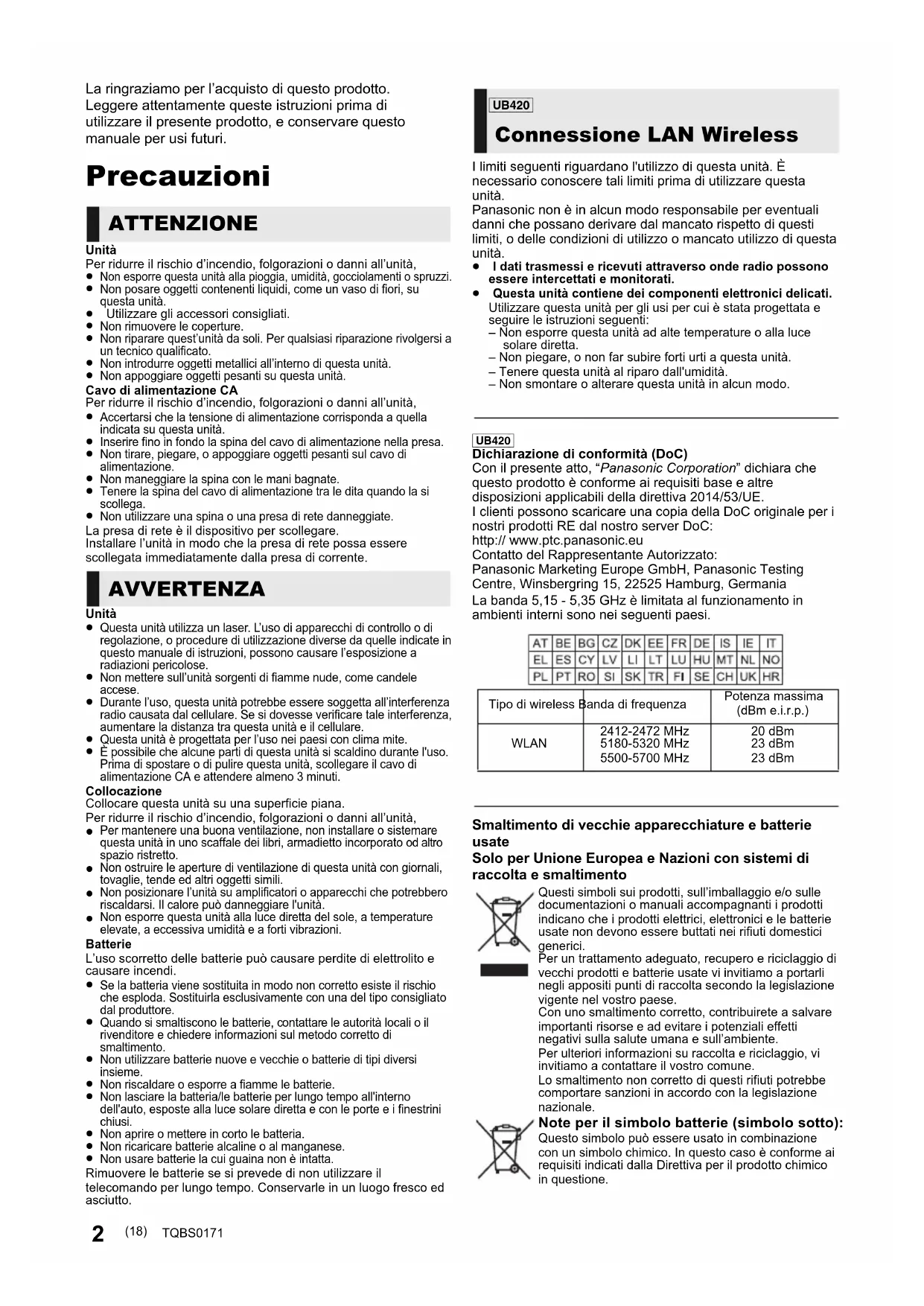 - Non lasciare la batteria/le batterie per lungo tempo all'interno dell'auto, esposte alla luce solare diretta e con le porte e i finestrini chiusi. Non aprire o mettere in corto le batteria. Non ricaricare batterie alcaline o al manganese. Non usare batterie la cui guaina non è intatta.Rimuovere le batterie se si prevede di non utilizzare il telecomando per lungo tempo. Conservarle in un luogo fresco ed asciutto. I limiti seguenti riguardano l'utilizzo di questa unità. È necessario conoscere tali limiti prima di utilizzare questa unità. Panasonic non è in alcun modo responsabile per eventuali danni che possano derivare dal mancato rispetto di questi limiti, o delle condizioni di utilizzo o mancato utilizzo di questa unità. ≥ I dati trasmessi e ricevuti attraverso onde radio possono essere intercettati e monitorati.≥ Questa unità contiene dei componenti elettronici delicati.Utilizzare questa unità per gli usi per cui è stata progettata e seguire le istruzioni seguenti:– Non esporre questa unità ad alte temperature o alla luce solare diretta.– Non piegare, o non far subire forti urti a questa unità.– Tenere questa unità al riparo dall'umidità.– Non smontare o alterare questa unità in alcun modo. Smaltimento di vecchie apparecchiature e batterie usate Solo per Unione Europea e Nazioni con sistemi di raccolta e smaltimento Questi simboli sui prodotti, sull’imballaggio e/o sulle documentazioni o manuali accompagnanti i prodotti indicano che i prodotti elettrici, elettronici e le batterie usate non devono essere buttati nei rifiuti domestici generici.Per un trattamento adeguato, recupero e riciclaggio di vecchi prodotti e batterie usate vi invitiamo a portarli negli appositi punti di raccolta secondo la legislazione vigente nel vostro paese.Con uno smaltimento corretto, contribuirete a salvare importanti risorse e ad evitare i potenziali effetti negativi sulla salute umana e sull’ambiente.Per ulteriori informazioni su raccolta e riciclaggio, vi invitiamo a contattare il vostro comune.Lo smaltimento non corretto di questi rifiuti potrebbe comportare sanzioni in accordo con la legislazione nazionale. Note per il simbolo batterie (simbolo sotto): Questo simbolo può essere usato in combinazione con un simbolo chimico. In questo caso è conforme ai requisiti indicati dalla Direttiva per il prodotto chimico in questione. ATTENZIONE AVVERTENZA [UB420] Connessione LAN Wireless [UB420] Dichiarazione di conformità (DoC) Con il presente atto, “Panasonic Corporation” dichiara che questo prodotto è conforme ai requisiti base e altre disposizioni applicabili della direttiva 2014/53/UE. I clienti possono scaricare una copia della DoC originale per i nostri prodotti RE dal nostro server DoC: http:// www.ptc.panasonic.eu Contatto del Rappresentante Autorizzato: Panasonic Marketing Europe GmbH, Panasonic Testing Centre, Winsbergring 15, 22525 Hamburg, Germania La banda 5,15 - 5,35 GHz è limitata al funzionamento in ambienti interni sono nei seguenti paesi. Tipo di wireless Banda di frequenzaPotenza massima(dBm e.i.r.p.) WLAN 2412-2472 MHz5180-5320 MHz5500-5700 MHz20 dBm23 dBm23 dBm (18) TQBS0171-Safety_ita.fm 2 ページ 2018年2月26日 月曜日 午後5時10分Italiano TQBS0171 Indice Precauzioni p. 2