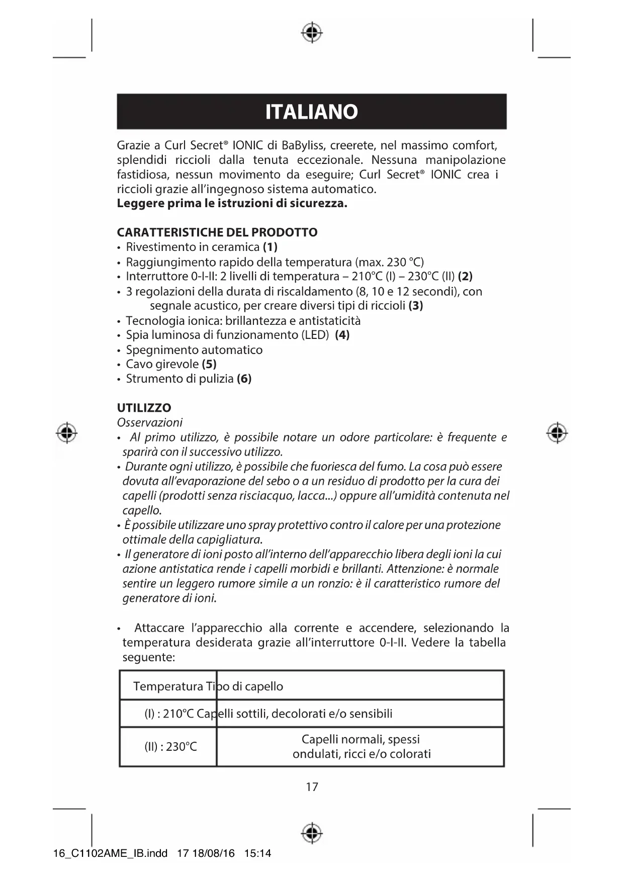 - Attaccare l’apparecchio alla corrente e accendere, selezionando la temperatura desiderata grazie all’interruttore 0-I-II. Vedere la tabella seguente: Temperatura Tipo di capello (I) : 210°C Capelli sottili, decolorati e/o sensibili (II) : 230°C Capelli normali, spessi ondulati, ricci e/o colorati 16_C1102AME_IB.indd 17 18/08/16 15:1418