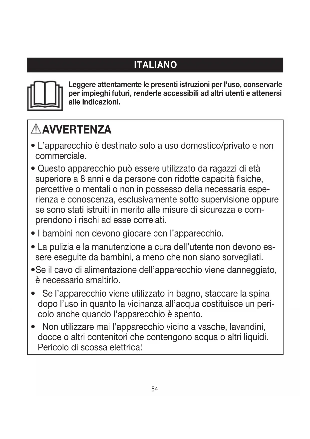 Non utilizzare mai l’apparecchio vicino a vasche, lavandini, docce o altri contenitori che contengono acqua o altri liquidi. Pericolo di scossa elettrica! Leggere attentamente le presenti istruzioni per l’uso, conservarle per impieghi futuri, renderle accessibili ad altri utenti e attenersi alle indicazioni.54 55