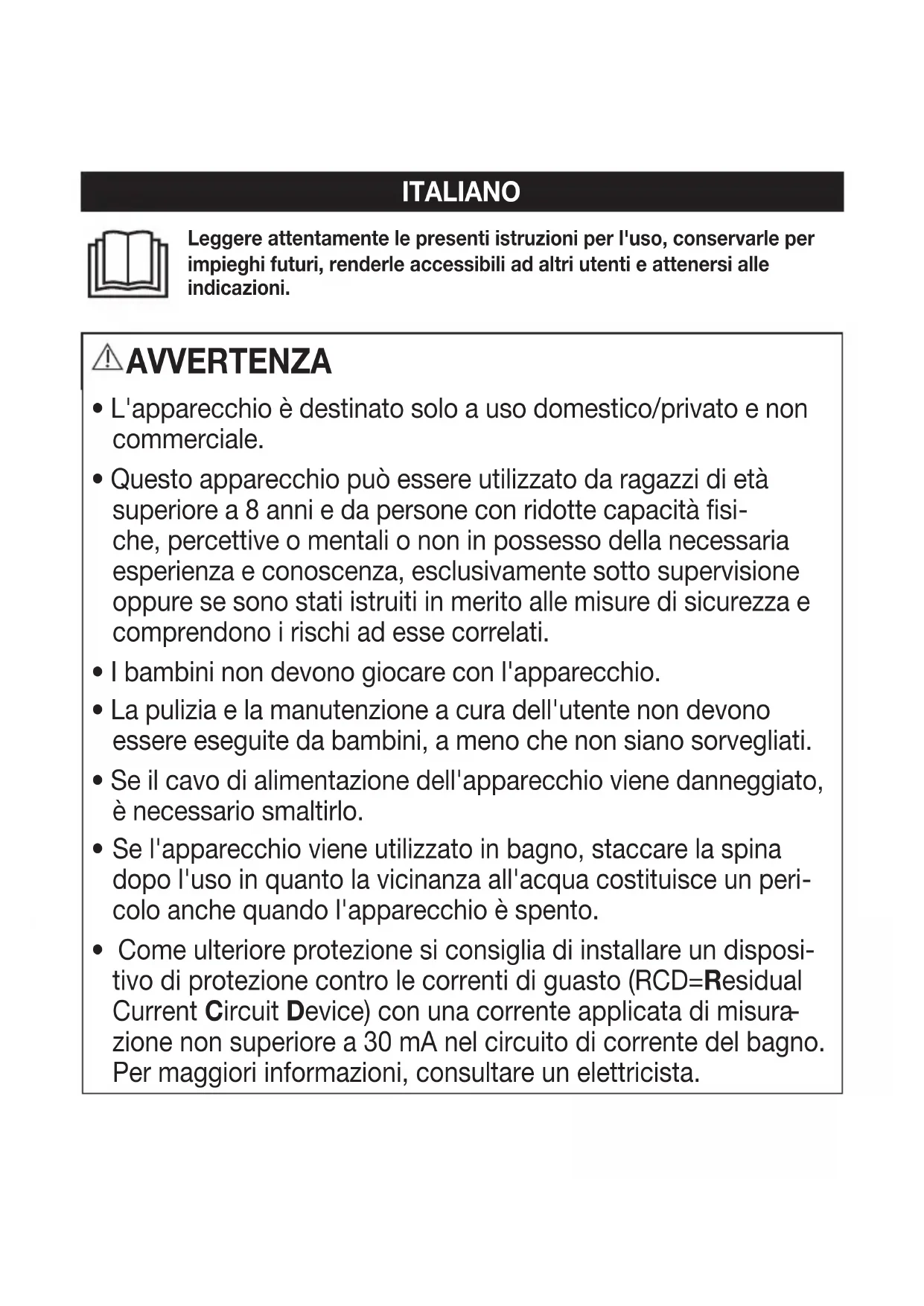 - Questo appearecchio può essere utilizzato da ragazzi di età superiore a 8 anni e da persone con ridotte capacità fisiche, percettive o mentali o non in possesso della necessaria esperienza e conoscenza, escludivamente sotto supervisione oppure se sono stati istruiti in merito alle misure di sicurezza e comprendono i rischi ad esse correlati.
