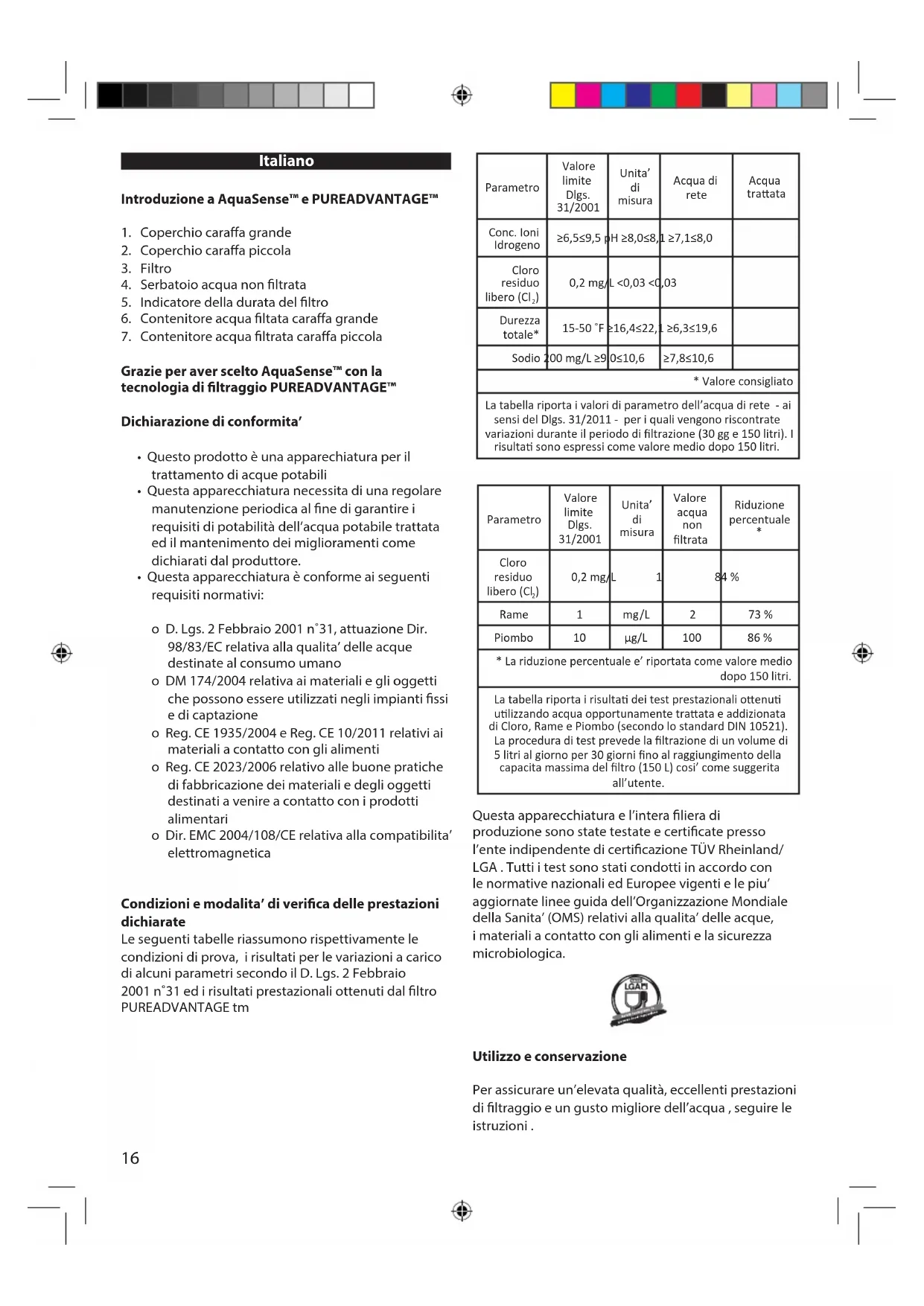 - Questa apparecchiatura è conforme ai seguenti requisiti normativi: o D. Lgs. 2 Febbraio 2001 n˚31, attuazione Dir. 98/83/EC relativa alla qualita’ delle acque destinate al consumo umano o DM 174/2004 relativa ai materiali e gli oggetti che possono essere utilizzati negli impianti ssi e di captazione o Reg. CE 1935/2004 e Reg. CE 10/2011 relativi ai materiali a contatto con gli alimenti o Reg. CE 2023/2006 relativo alle buone pratiche di fabbricazione dei materiali e degli oggetti destinati a venire a contatto con i prodotti alimentari o Dir. EMC 2004/108/CE relativa alla compatibilita’ elettromagnetica Condizioni e modalita’ di verica delle prestazioni dichiarate Le seguenti tabelle riassumono rispettivamente le condizioni di prova, i risultati per le variazioni a carico di alcuni parametri secondo il D. Lgs. 2 Febbraio 2001 n˚31 ed i risultati prestazionali ottenuti dal ltro PUREADVANTAGE tm Questa apparecchiatura e l’intera liera di produzione sono state testate e certicate presso l’ente indipendente di certicazione TÜV Rheinland/ LGA . Tutti i test sono stati condotti in accordo con le normative nazionali ed Europee vigenti e le piu’ aggiornate linee guida dell’Organizzazione Mondiale della Sanita’ (OMS) relativi alla qualita’ delle acque, i materiali a contatto con gli alimenti e la sicurezza microbiologica. Utilizzo e conservazione Per assicurare un’elevata qualità, eccellenti prestazioni di ltraggio e un gusto migliore dell’acqua , seguire le istruzioni . Parametro Valore limite Dlgs. 31/2001 Unita’