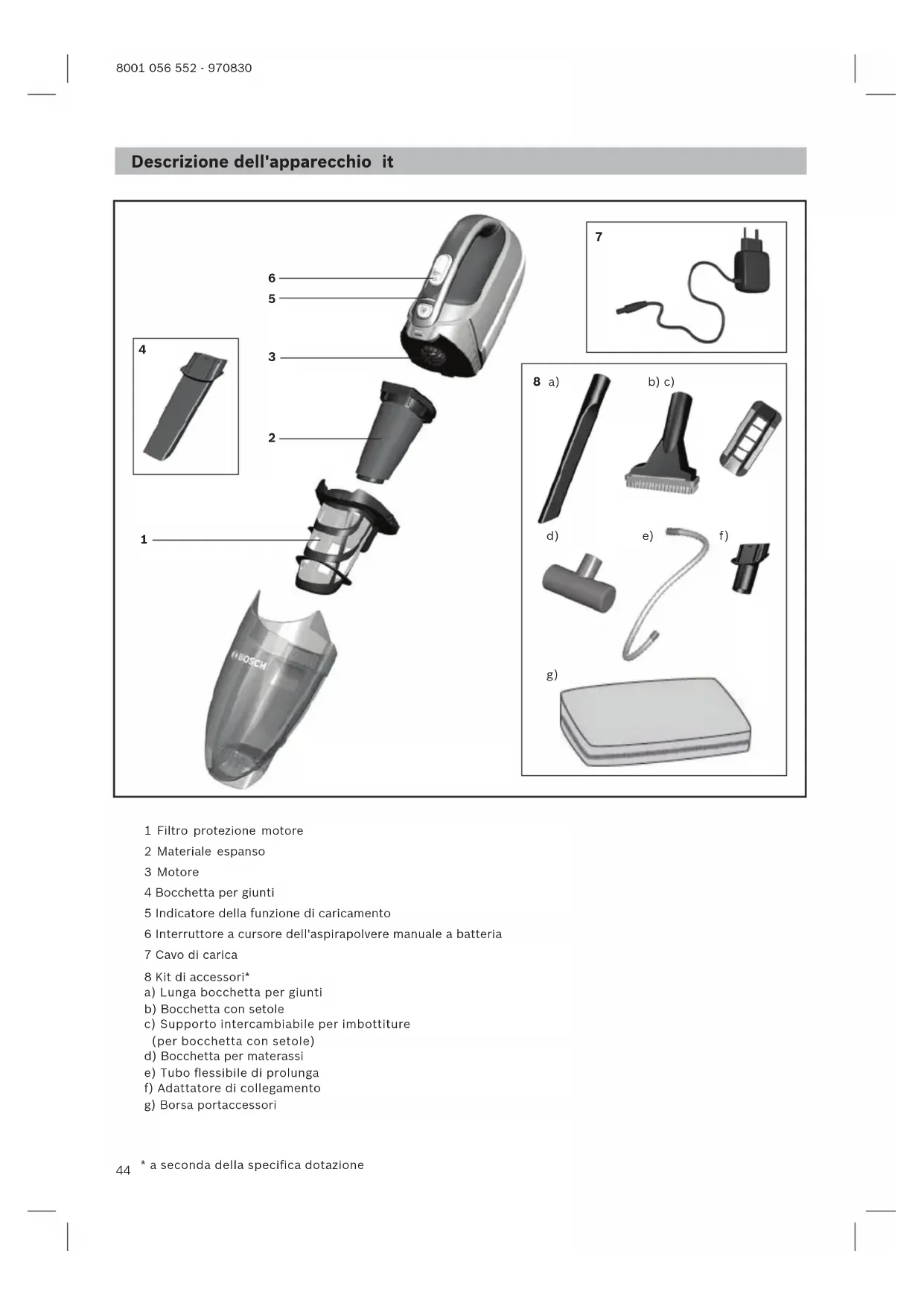 N'utilisez aucun produit récurant, nettoyant pour vitre, ni aucun nettoyant universel. Ne plongez jamais l'appareil dans l'eau. Sous réserve de modifications techniques.44 8001 056 552 - 970830 Descrizione dell'apparecchio it 1 Filtro protezione motore 2 Materiale espanso 3 Motore 4 Bocchetta per giunti 5 Indicatore della funzione di caricamento 6 Interruttore a cursore dell'aspirapolvere manuale a batteria 7 Cavo di carica 8 Kit di accessori* a) Lunga bocchetta per giunti b) Bocchetta con setole c) Supporto intercambiabile per imbottiture (per bocchetta con setole) d) Bocchetta per materassi e) Tubo flessibile di prolunga f) Adattatore di collegamento g) Borsa portaccessori