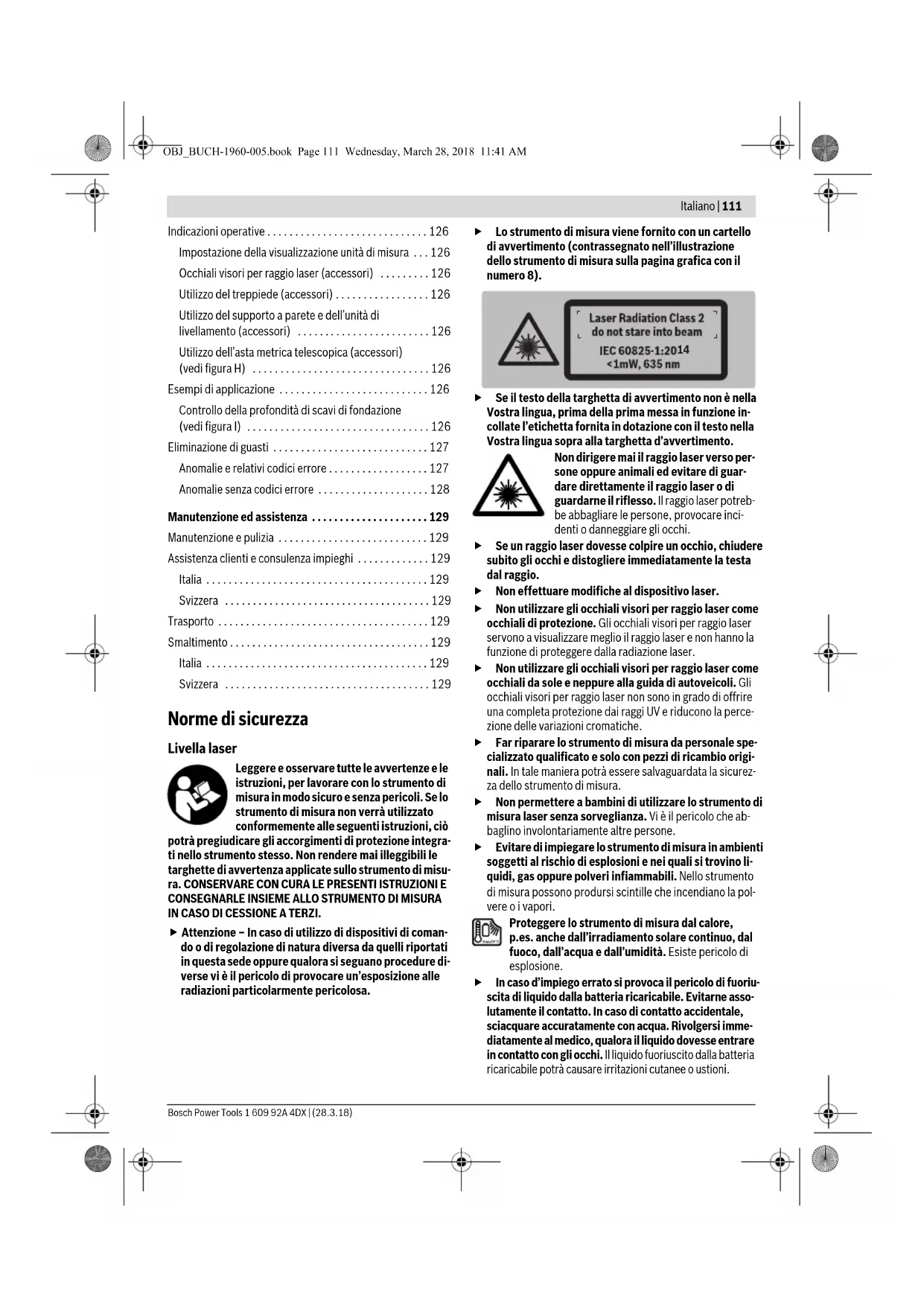 - +40 °C). Mentre lo strumento di misura e il ricevitore laser erano accesi, la batteria del ricevitore laser si è scaricata. – Premere il tasto Reset 13. Lo strumento di misura verrà spento. Il ricevitore laser è difettoso, si è bloccato o è andato perso e l’allarme antifurto è intervenuto. – Premere il tasto Reset 13. Il segnale acustico e lo strumento di misura verranno spenti. Nel ricevitore laser si verifica un’anomalia software transitoria. – Per riportare il ricevitore laser nello stato alla consegna, pre- mere contemporaneamente il tasto ON/OFF 17 e il tasto di impostazione precisione di misura 23. Le impostazioni standard per precisione di misura (media), illuminazione display (attiva), visualizzazione unità di misu- ra (mm) e segnale acustico (normale) verranno ripristinate. Visualizzazione codice errore Problema Rimedi OBJ_BUCH-1960-005.book Page 128 Wednesday, March 28, 2018 11:41 AMItaliano | 129 Bosch Power Tools 1 609 92A 4DX | (28.3.18) Manutenzione ed assistenza Manutenzione e pulizia – Avere cura di tenere la livella laser, la stazione di ricarica ed il ricevitore laser sempre puliti. – Non immergere la livella laser, la stazione di ricarica ed il ri- cevitore laser in acqua o in altri liquidi. – Pulire ogni tipo di sporcizia utilizzando un panno umido e morbido. Non utilizzare mai prodotti detergenti e neppure solventi. – Pulire regolarmente la livella laser, specialmente le super- fici dell’uscita del raggio laser prestando particolare atten- zione alla presenza di pelucchi. Assistenza clienti e consulenza impieghi Il servizio di assistenza risponde alle Vostre domande relative alla riparazione ed alla manutenzione del Vostro prodotto nonché concernenti le parti di ricambio. Disegni in vista esplosa ed informazioni relative alle parti di ricambio sono consultabili anche sul sito: www.bosch-pt.com Il team Bosch che si occupa della consulenza impieghi vi aiu- terà in caso di domande relative ai nostri prodotti ed ai loro accessori. In caso di richieste o di ordinazione di pezzi di ricambio, comunicare sempre il codice prodotto a 10 cifre riportato sulla targhetta di fabbricazione del prodotto. Italia Officina Elettroutensili Robert Bosch S.p.A. Corso Europa 2/A 20020 LAINATE (MI) Tel.: (02) 3696 2663 Fax: (02) 3696 2662 Fax: (02) 3696 8677 E-Mail: officina.elettroutensili@it.bosch.com Svizzera Sul sito www.bosch-pt.com/ch/it è possible ordinare diretta- mente on-line i ricambi. Tel.: (044) 8471513 Fax: (044) 8471553 E-Mail: Aftersales.Service@de.bosch.com Trasporto Le batterie ricaricabili agli ioni di litio contenute sono soggette ai requisiti di legge relativi a merci pericolose. Le batterie rica- ricabili possono essere trasportate su strada tramite l’utente senza ulteriori precauzioni. In caso di spedizione tramite terzi (es.: trasporto aereo oppu- re spedizioniere) devono essere osservati particolari requisiti relativi ad imballo e marcatura. In questo caso per la prepara- zione del pezzo da spedire è necessario ricorrere ad un esper- to per merce pericolosa. Spedire batterie ricaricabili solamente se la carcassa non è danneggiata. Coprire con nastro adesivo i contatti scoperti ed imballare la batteria ricaricabile in modo tale che non si muo- va nell’imballo. Vi preghiamo di osservare anche eventuali ulteriori norme nazionali. Smaltimento Avviare ad un riciclaggio rispettoso dell’ambiente la livella laser, la stazione di ricarica, il ricevitore laser, le batterie ricaricabili, gli accessori e gli imballaggi scartati. Non gettare livella laser, stazione di ricarica, ricevi- tore laser e batterie ricaricabili/batterie tra i rifiuti domestici! Solo per i Paesi della CE: Conformemente alla direttiva europea 2012/19/UE gli stru- menti di misura diventati inservibili e, in base alla direttiva eu- ropea 2006/66/CE, le batterie ricaricabili/ batterie difettose o consumate devono essere raccolte separatamente ed esse- re inviate ad una riutilizzazione ecologica. Per le batterie ricaricabili/le batterie non funzionanti rivolgersi al Consorzio: Italia Ecoelit Viale Misurata 32 20146 Milano Tel.: +39 02 / 4 23 68 63 Fax: +39 02 / 48 95 18 93 Svizzera Batrec AG 3752 Wimmis BE Le batterie integrate possono essere estratte esclusiva- mente da personale specializzato, per essere smaltite. L'apertura dell'involucro dell'alloggiamento può danneg- giare lo strumento di misura in modo irreparabile. Per rimuovere la batteria dallo strumento di misura, la batte- ria stessa deve essere completamente scarica. Per estrarre la batteria svitare le viti dell’alloggiamento e rimuovere l’involu- cro dell’alloggiamento stesso. Per evitare un cortocircuito, scollegare i collegamenti sulla batteria uno alla volta in se- quenza e isolare quindi i poli. Anche quando è completamente scarica, nella batteria rimane sempre una capacità residua che potrebbe sprigionarsi in caso di cortocircuito. Batterie ricaricabili/Batterie: Li-Ion: Si prega di tener presente le indica- zioni riportare nel paragrafo «Trasporto», pag. 129. Con ogni riserva di modifiche tecniche. OBJ_BUCH-1960-005.book Page 129 Wednesday, March 28, 2018 11:41 AM130 | Nederlands 1 609 92A 4DX | (28.3.18) Bosch Power Tools Nederlands Inhoudsopgave Veiligheidsvoorschriften p. 131