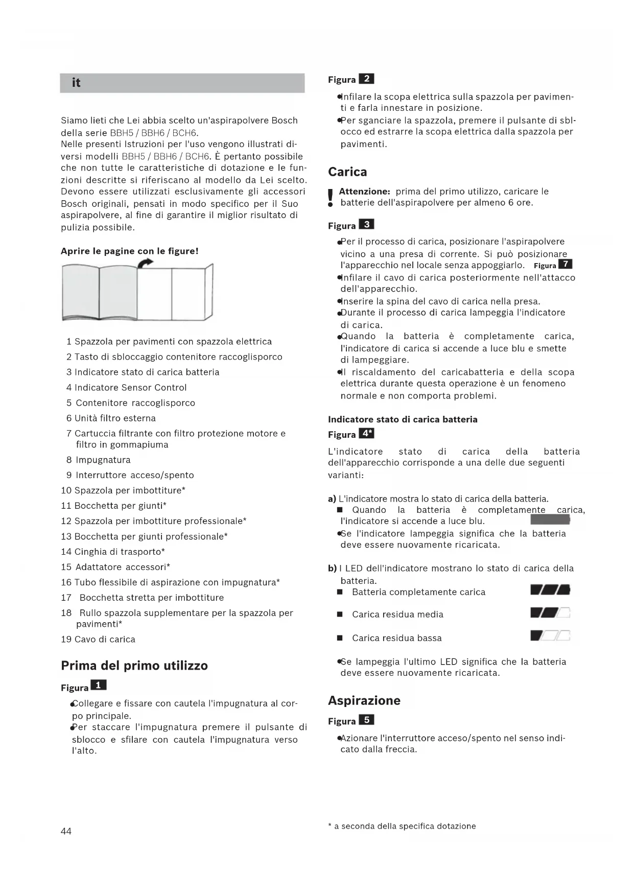 Siamo lieti che Lei abbia scelto un'aspirapolvere Bosch della serie BBH5 / BBH6 / BCH6. Nelle presenti Istruzioni per l'uso vengono illustrati di- versi modelli BBH5 / BBH6 / BCH6. È pertanto possibile che non tutte le caratteristiche di dotazione e le fun- zioni descritte si riferiscano al modello da Lei scelto. Devono essere utilizzati esclusivamente gli accessori Bosch originali, pensati in modo specifico per il Suo aspirapolvere, al fine di garantire il miglior risultato di pulizia possibile. Aprire le pagine con le figure! 1 Spazzola per pavimenti con spazzola elettrica 2 Tasto di sbloccaggio contenitore raccoglisporco 3 Indicatore stato di carica batteria 4 Indicatore Sensor Control 5 Contenitore raccoglisporco 6 Unità filtro esterna 7 Cartuccia filtrante con filtro protezione motore e filtro in gommapiuma 8 Impugnatura 9 Interruttore acceso/spento 10 Spazzola per imbottiture* 11 Bocchetta per giunti* 12 Spazzola per imbottiture professionale* 13 Bocchetta per giunti professionale* 14 Cinghia di trasporto* 15 Adattatore accessori* 16 Tubo flessibile di aspirazione con impugnatura* 17 Bocchetta stretta per imbottiture 18 Rullo spazzola supplementare per la spazzola per pavimenti* 19 Cavo di carica Prima del primo utilizzo Figura
